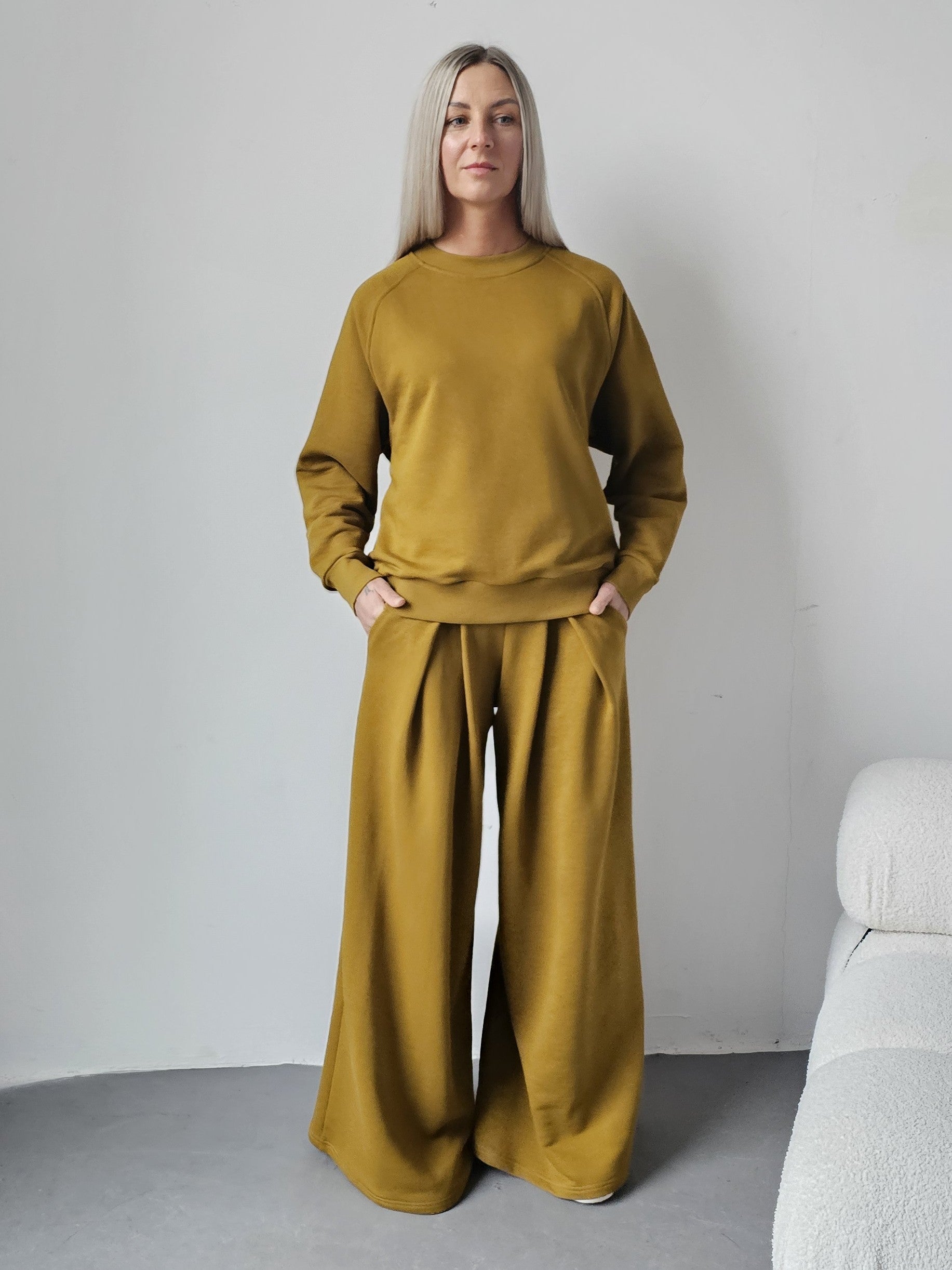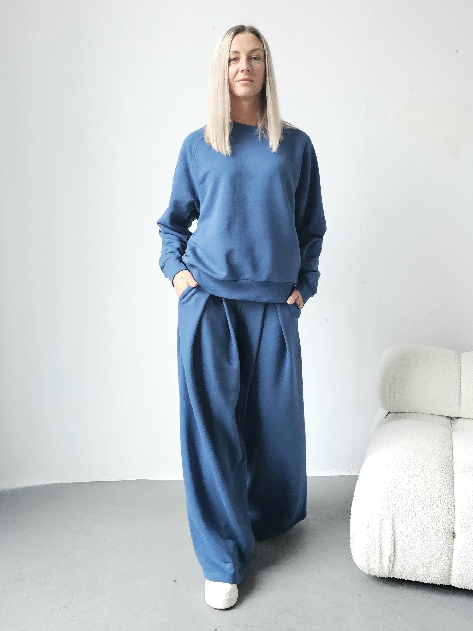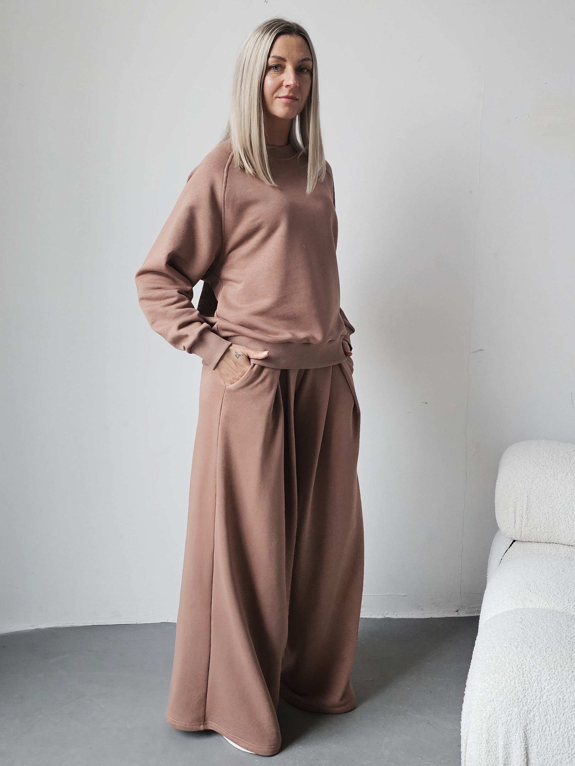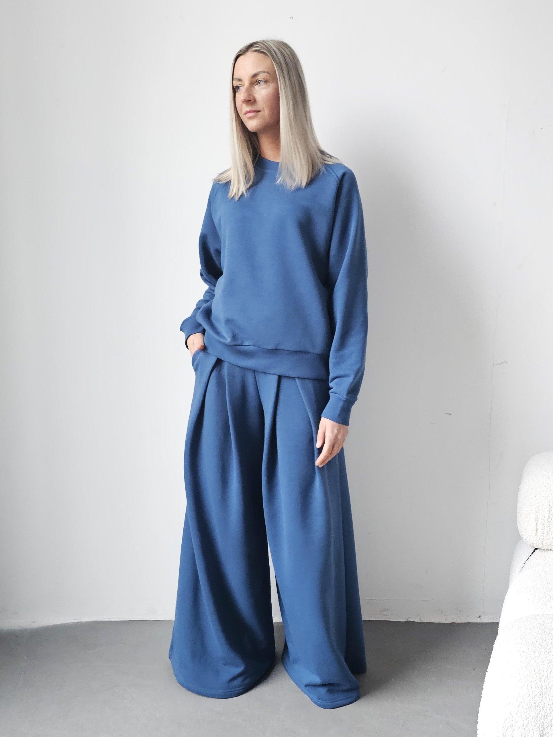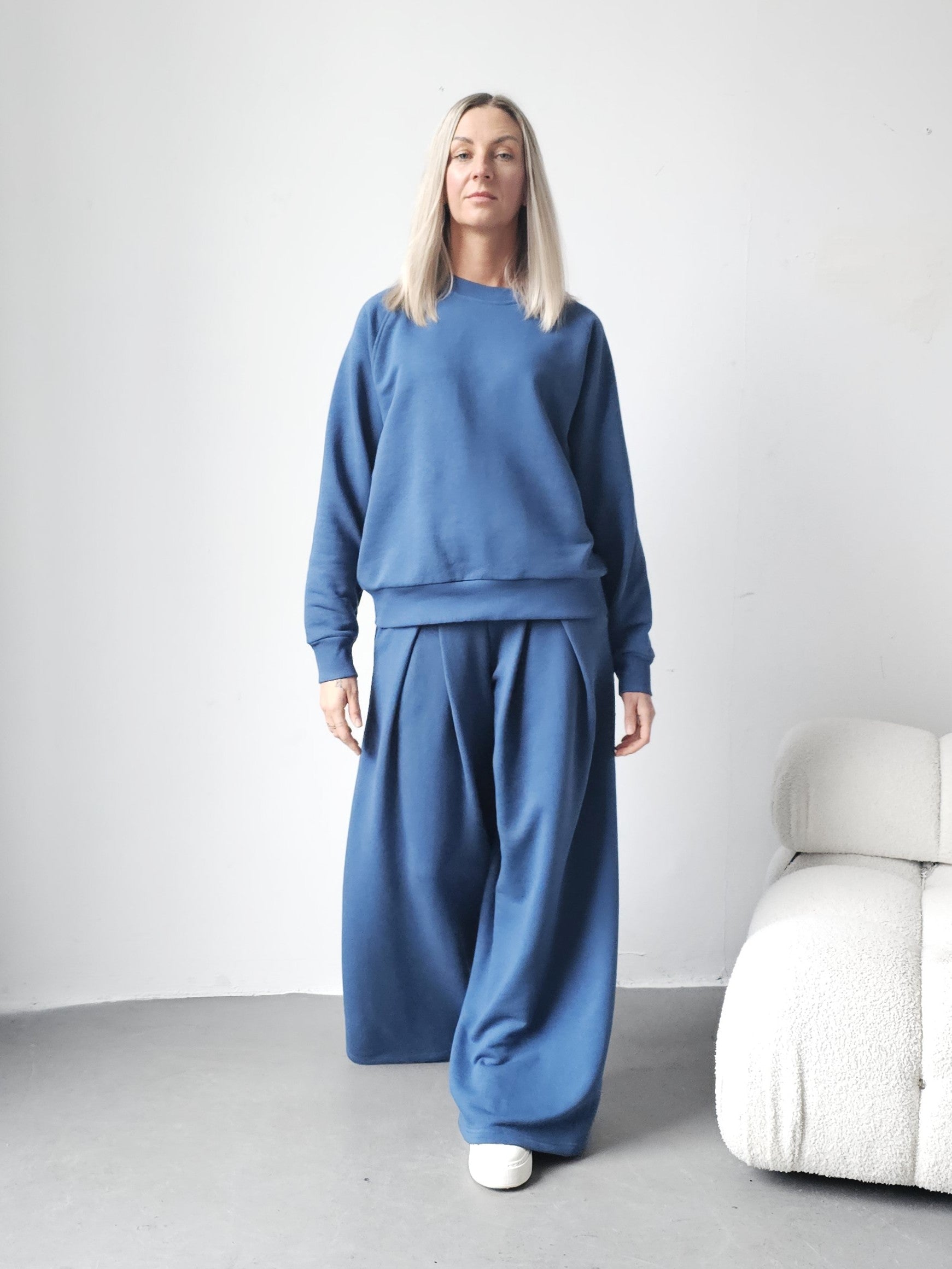 Sarai wygodny komplet bluza i szerokie spodnie z zakładkami