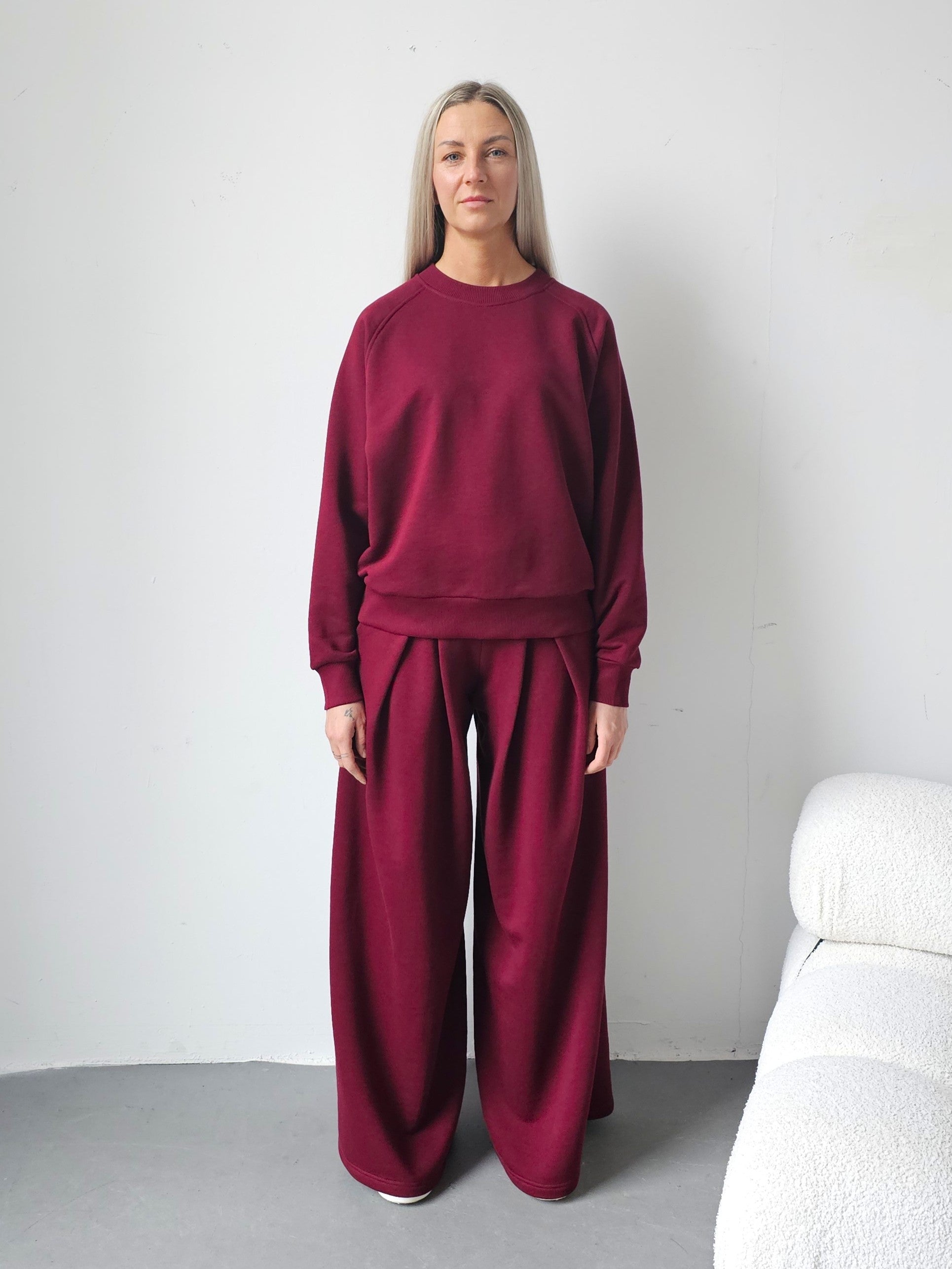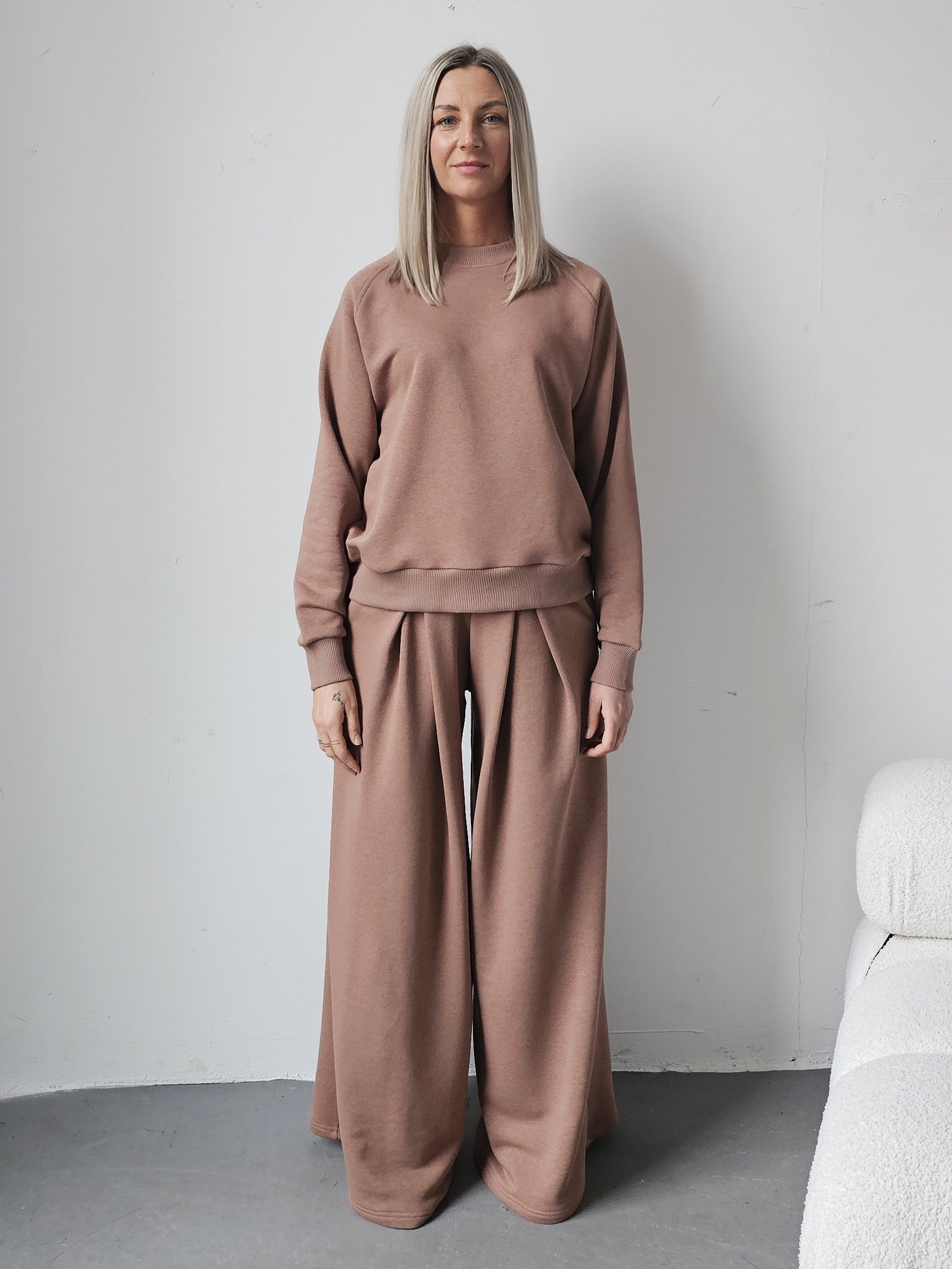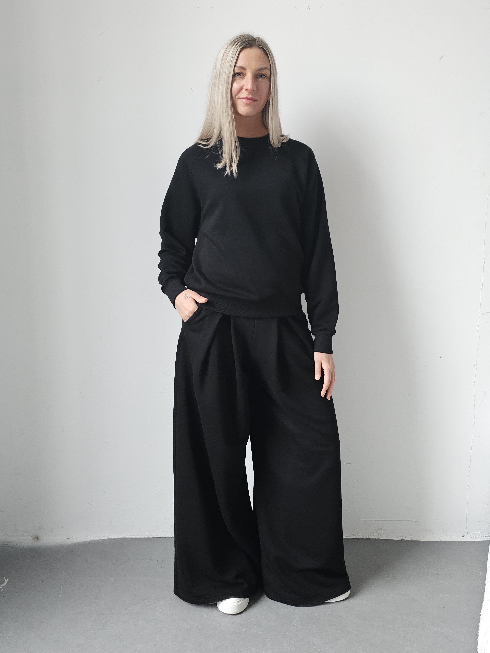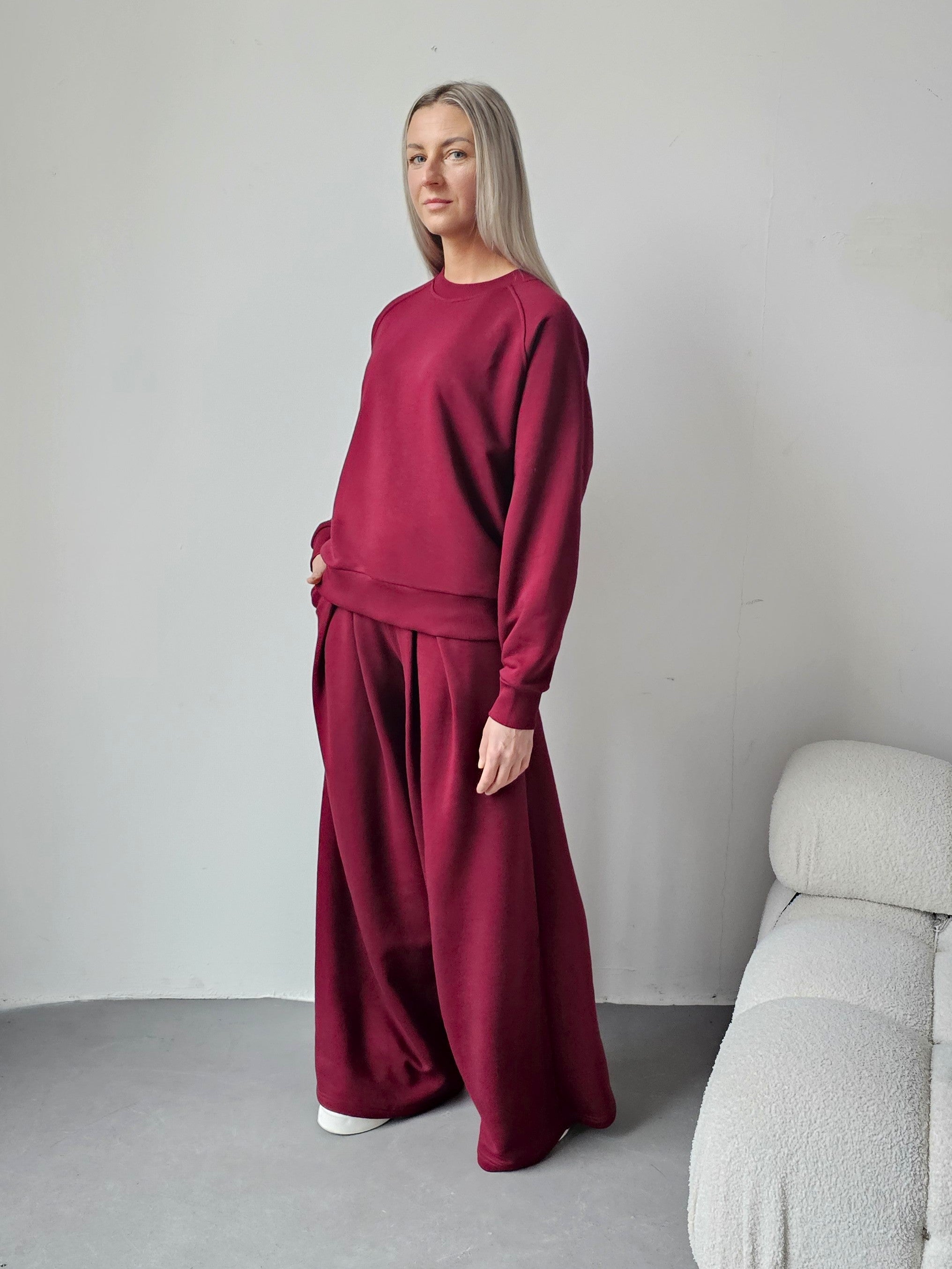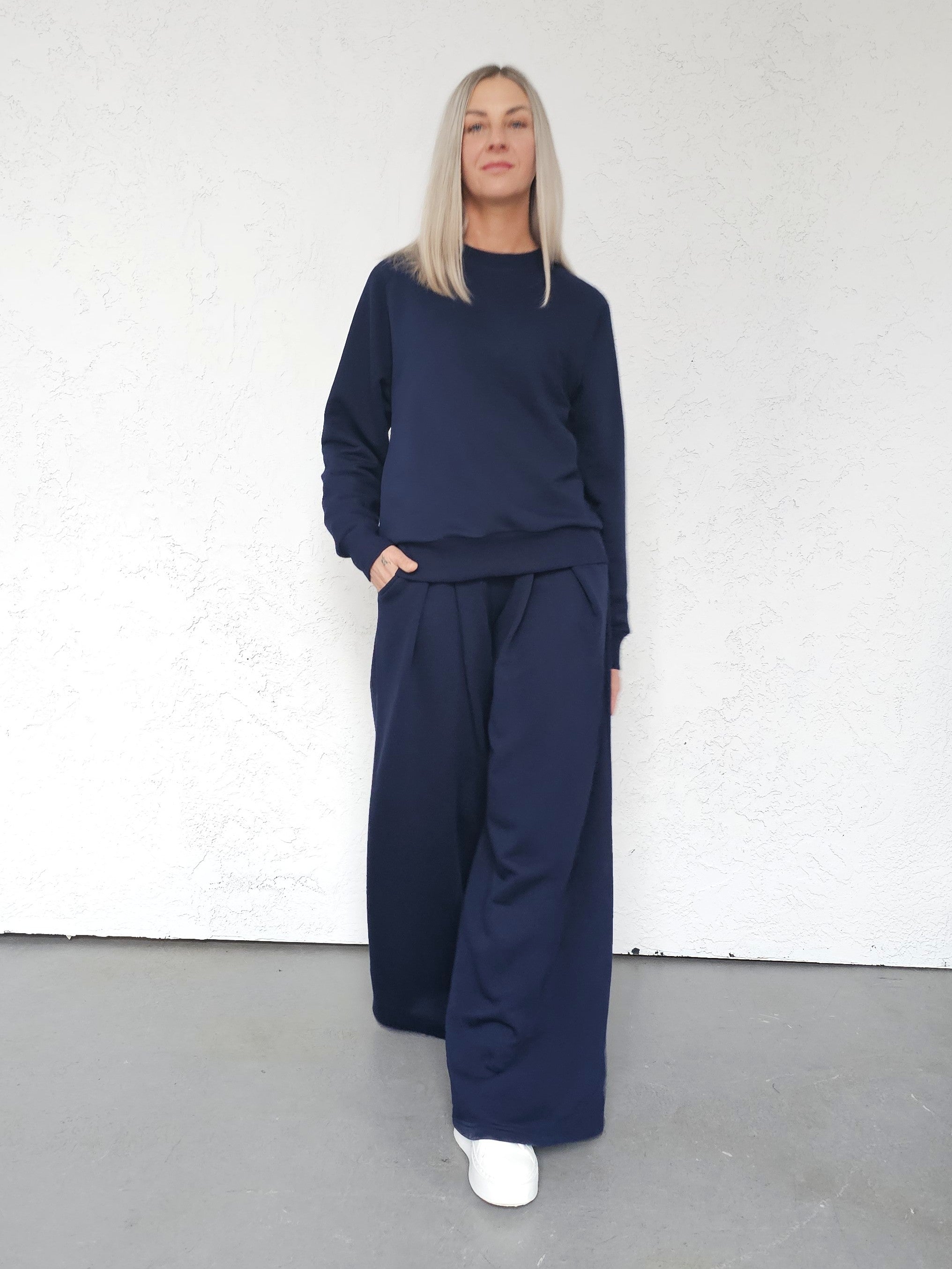 Sarai wygodny komplet bluza i szerokie spodnie z zakładkami