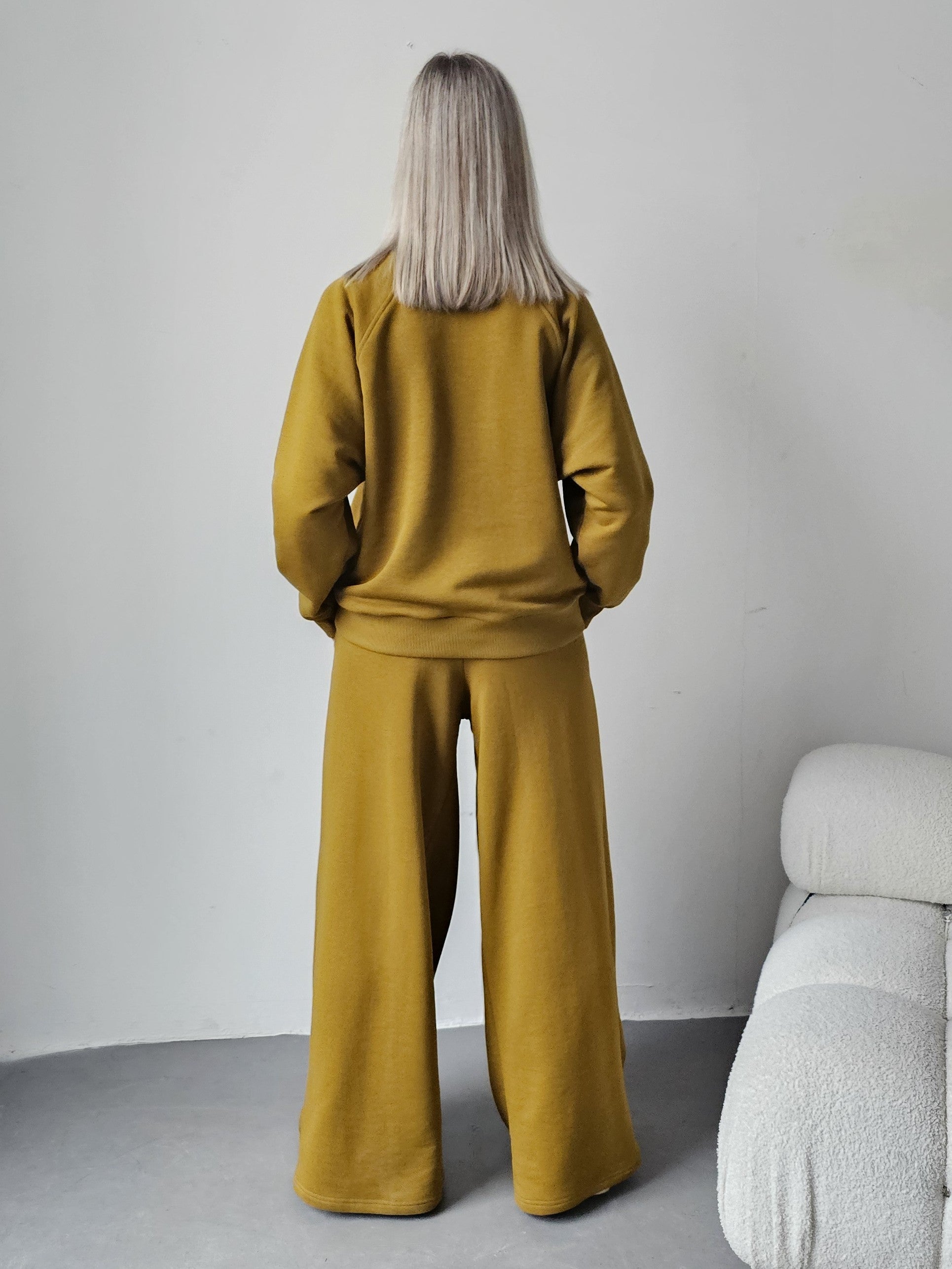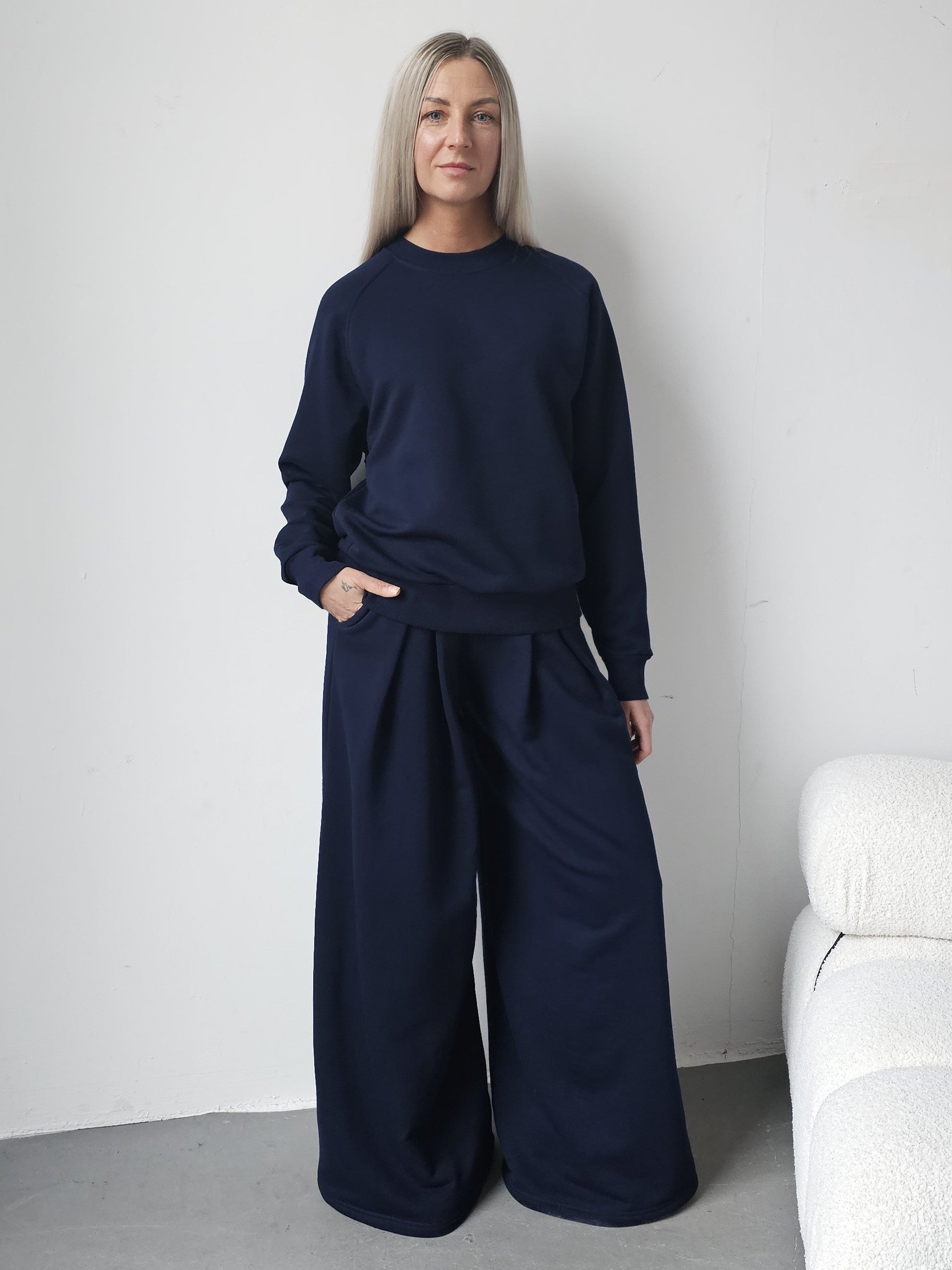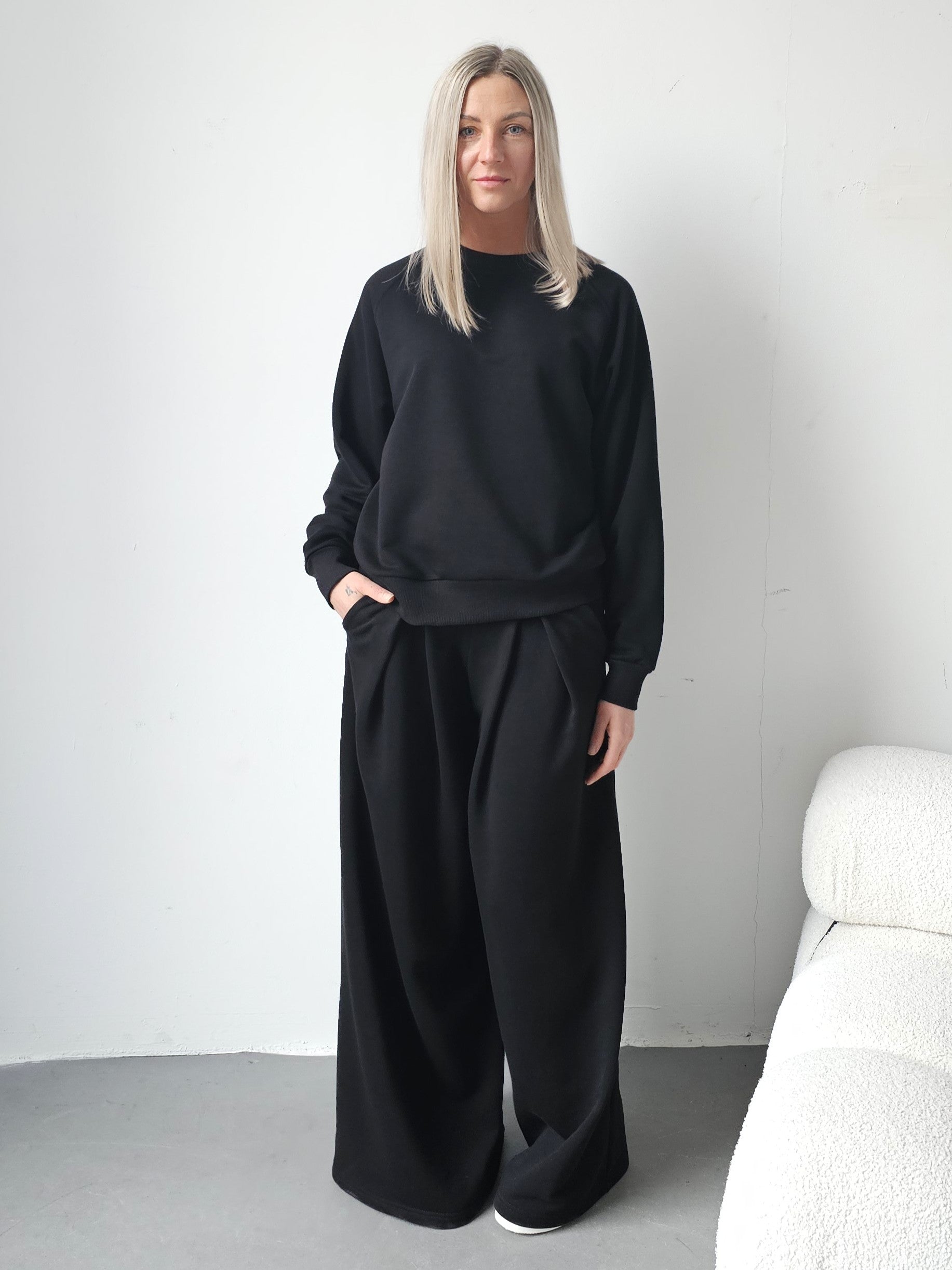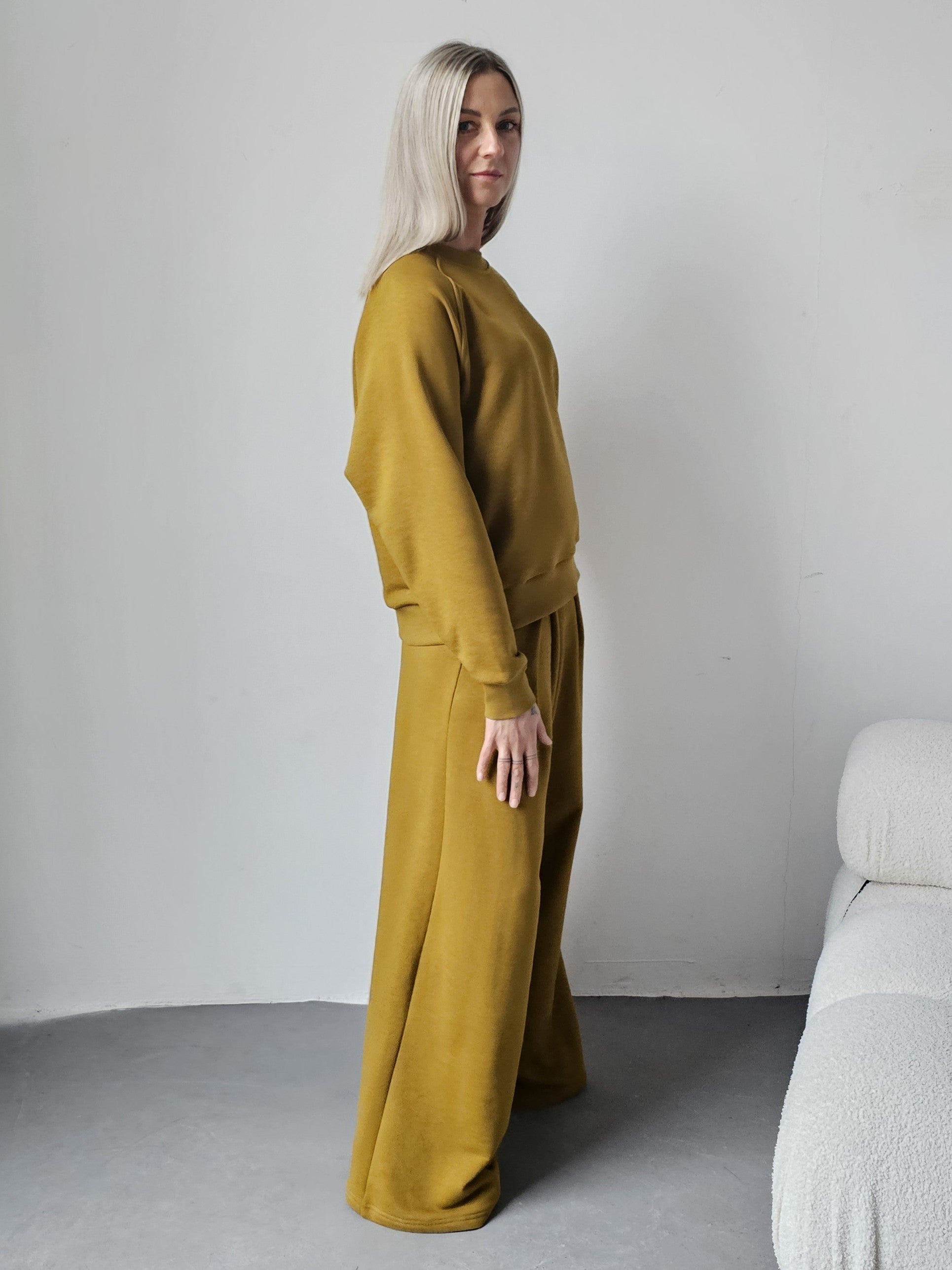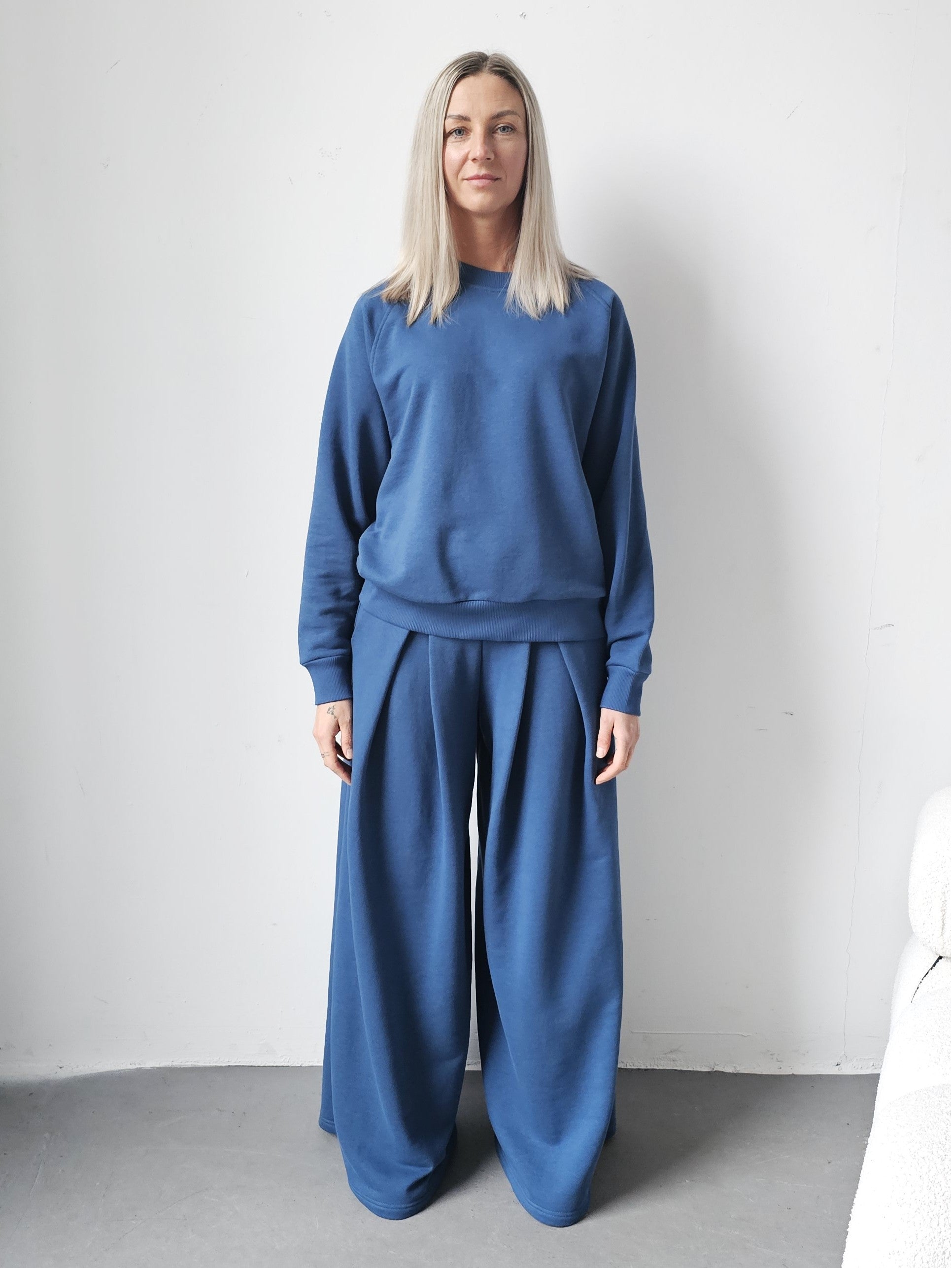 Sarai wygodny komplet bluza i szerokie spodnie z zakładkami