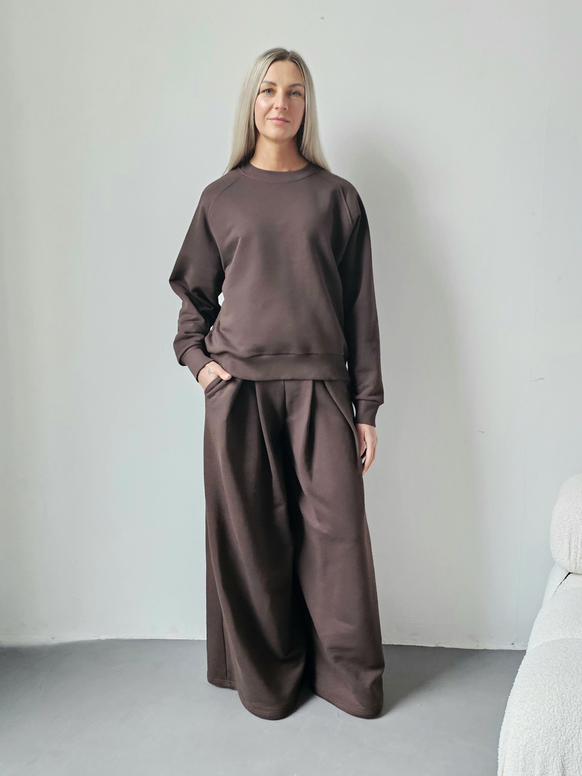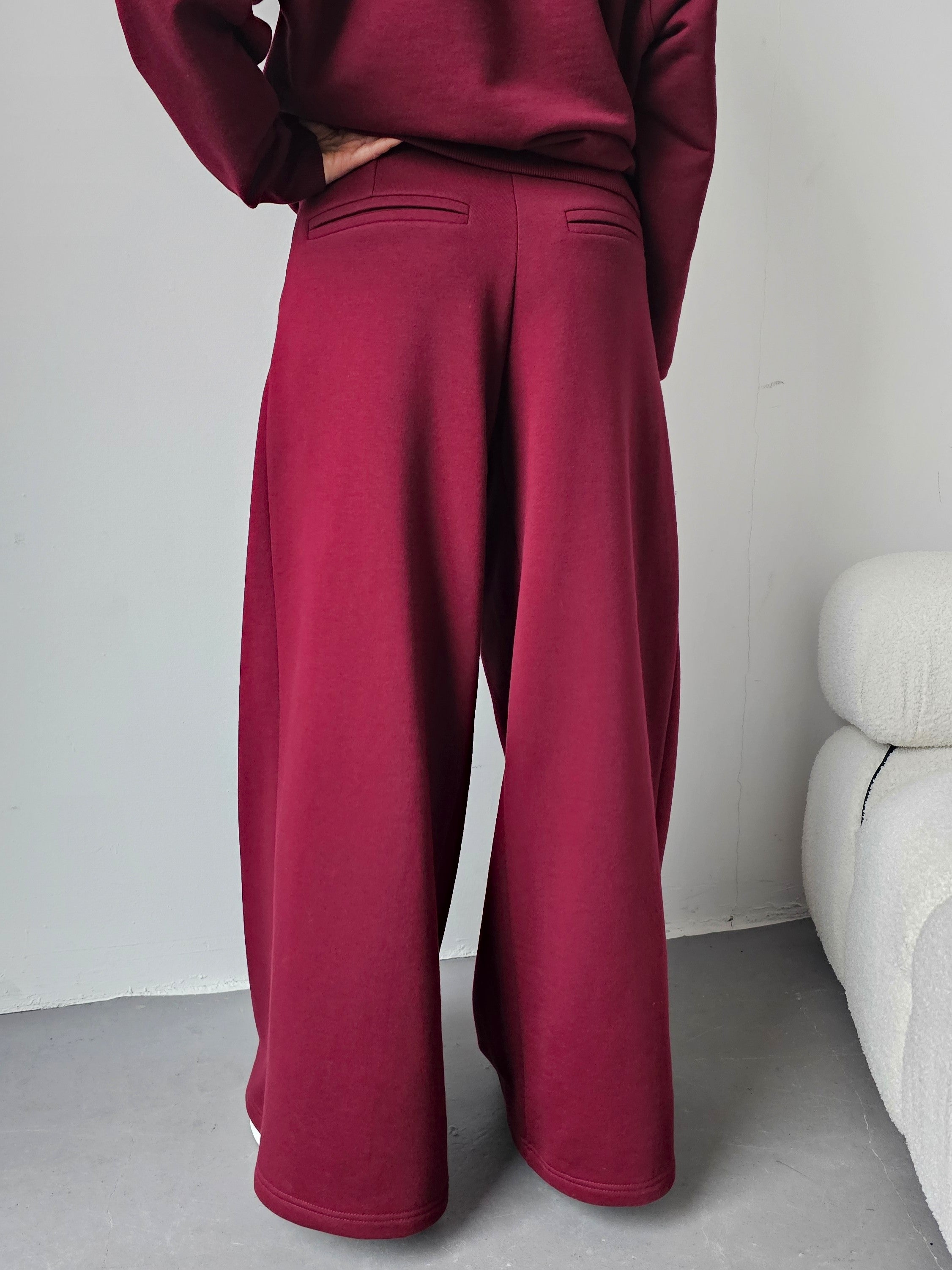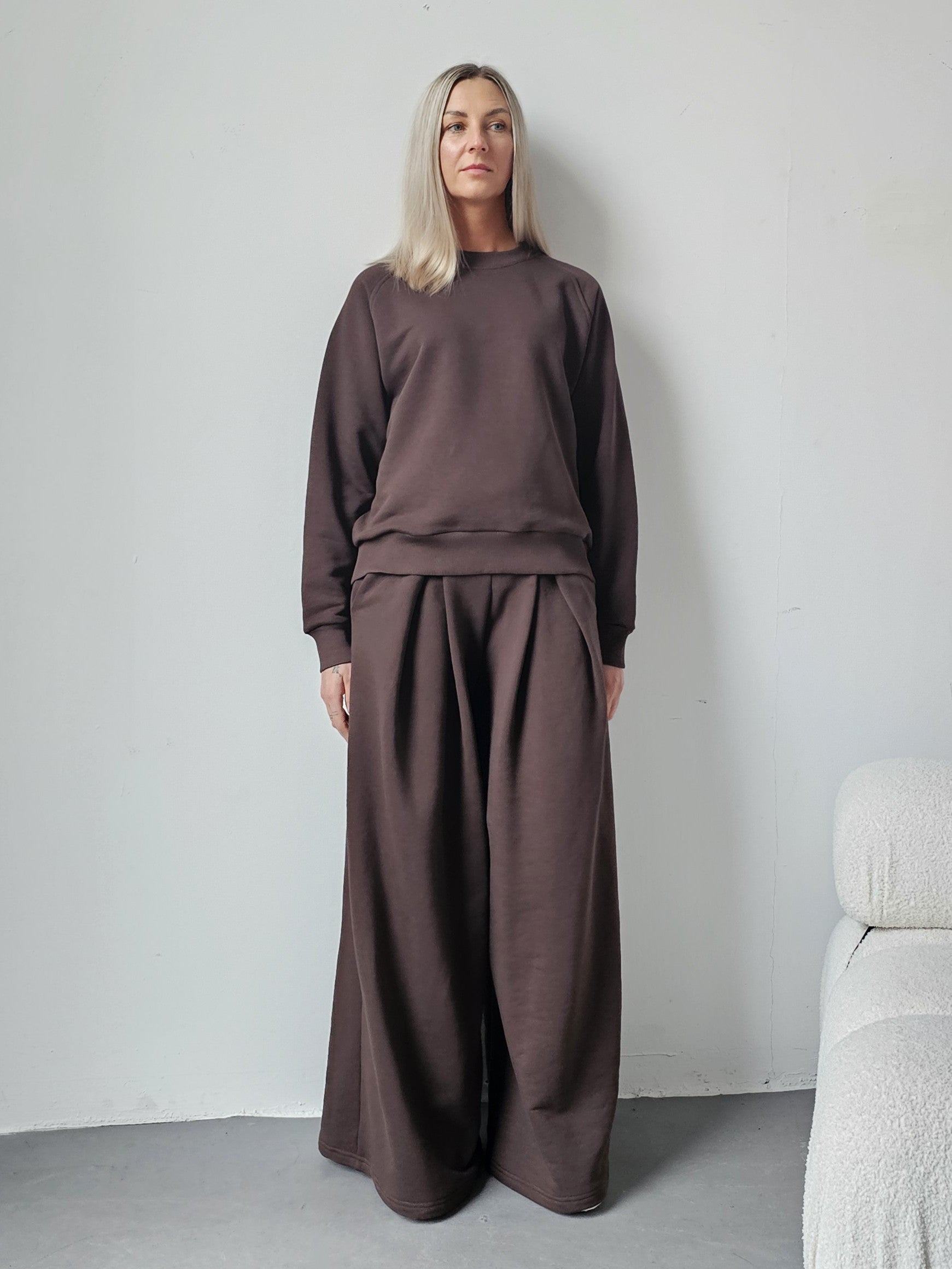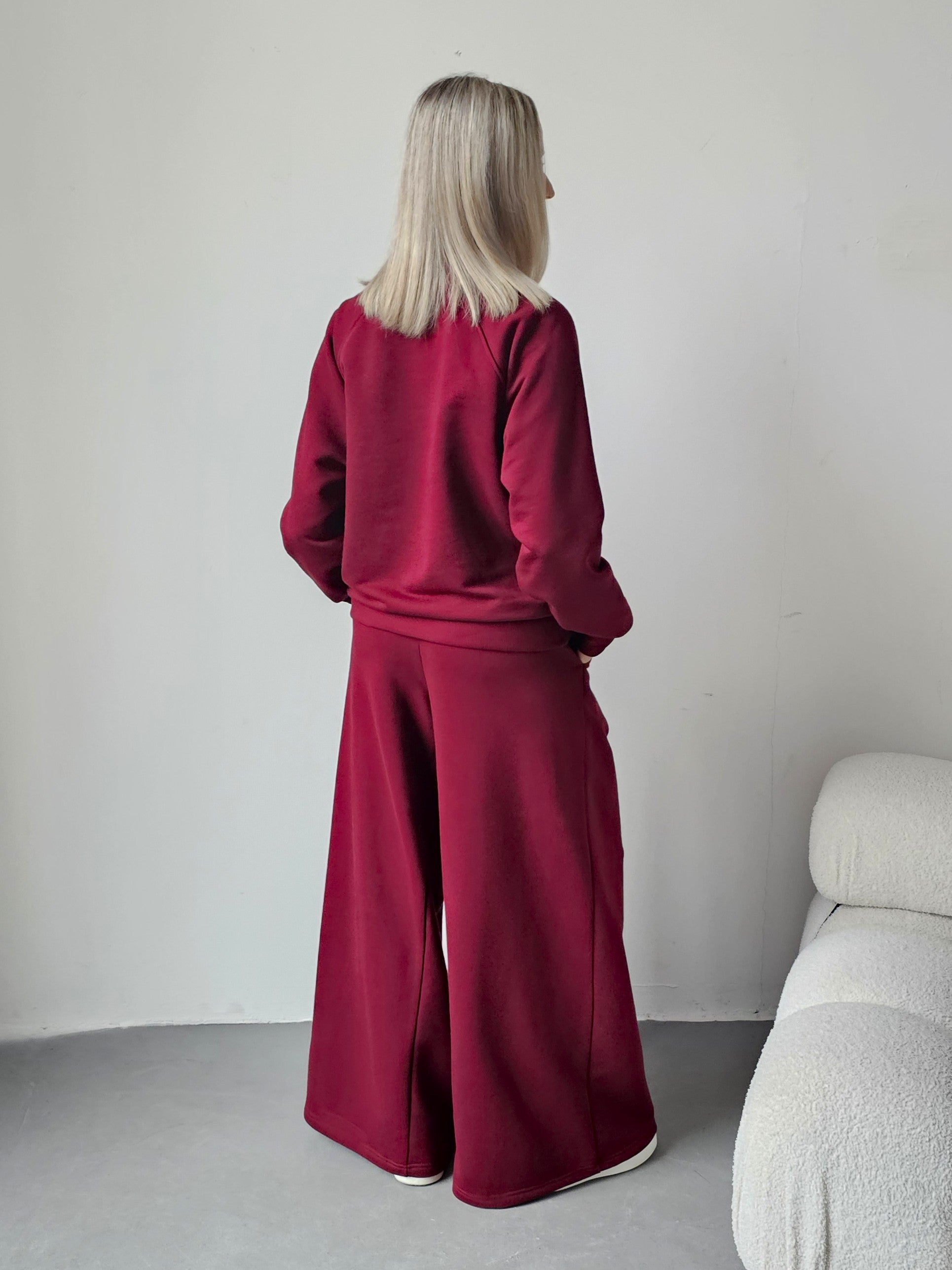Sarai wygodny komplet bluza i szerokie spodnie z zakładkami