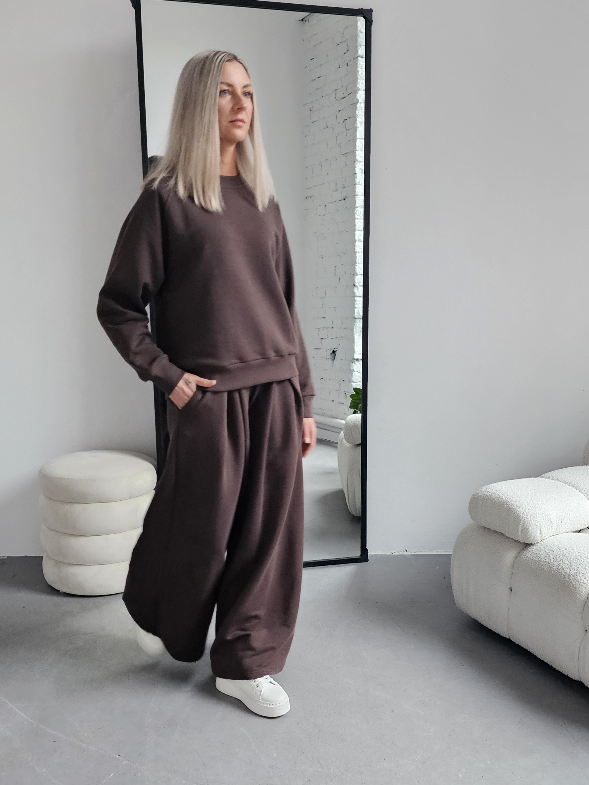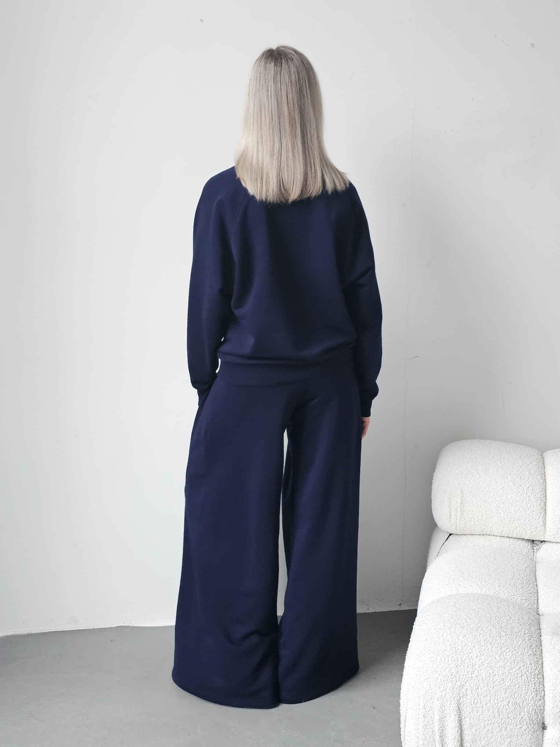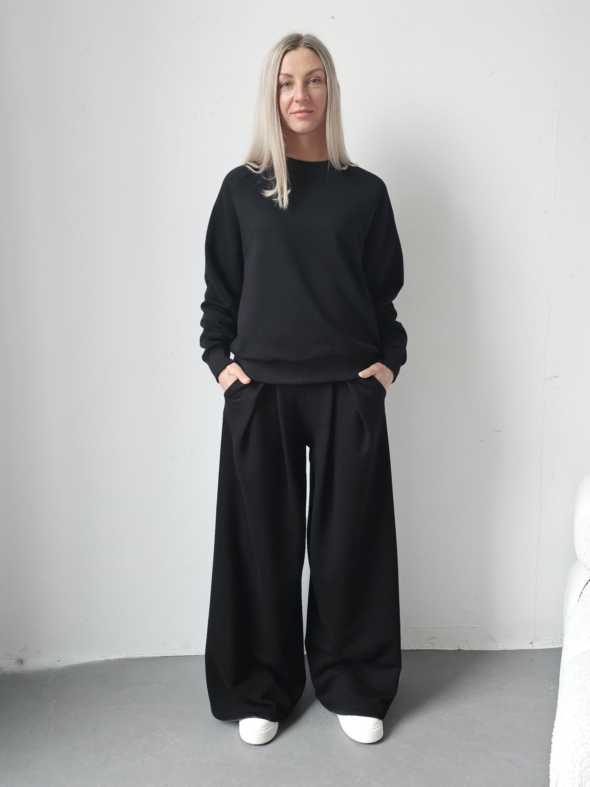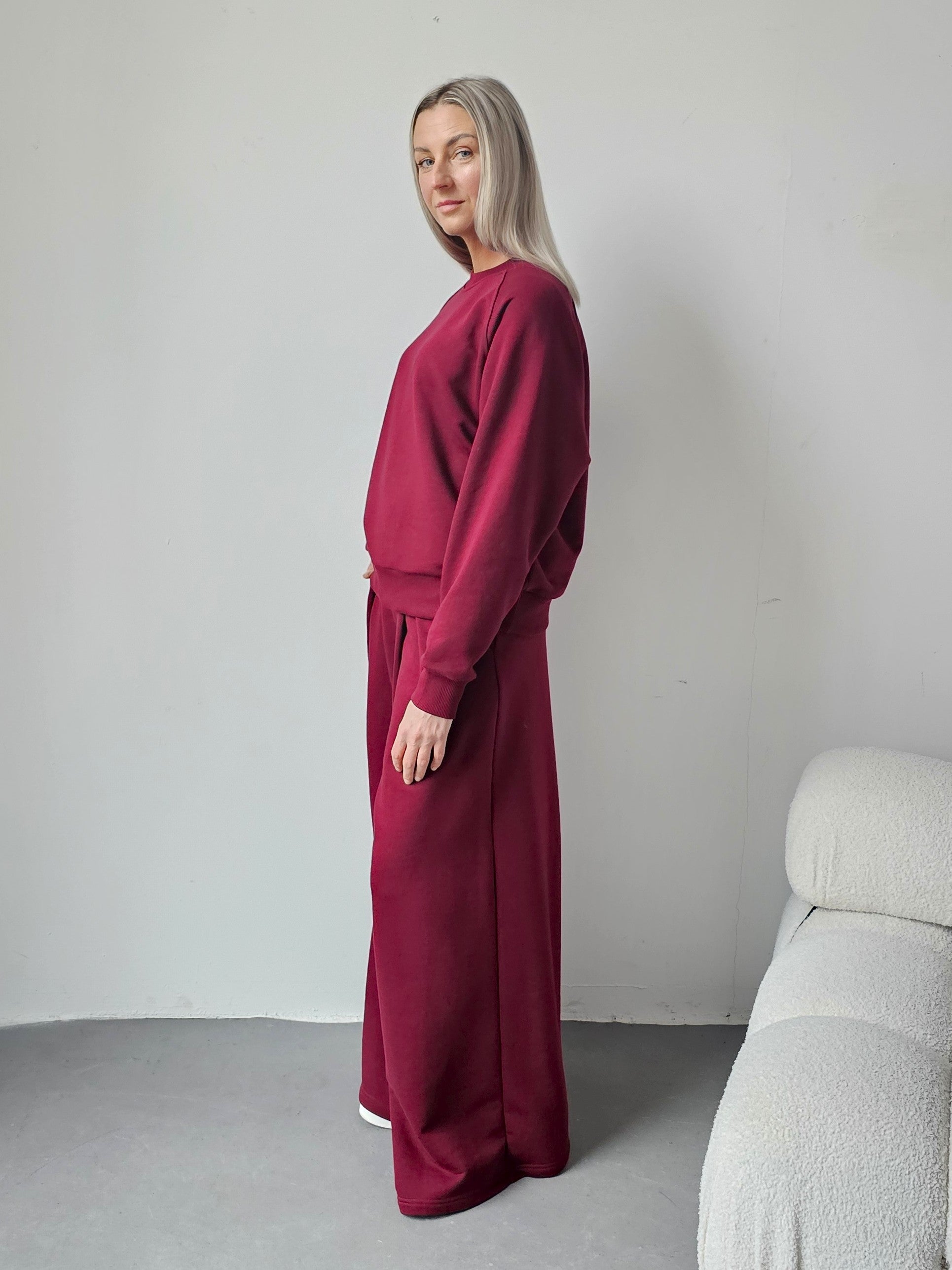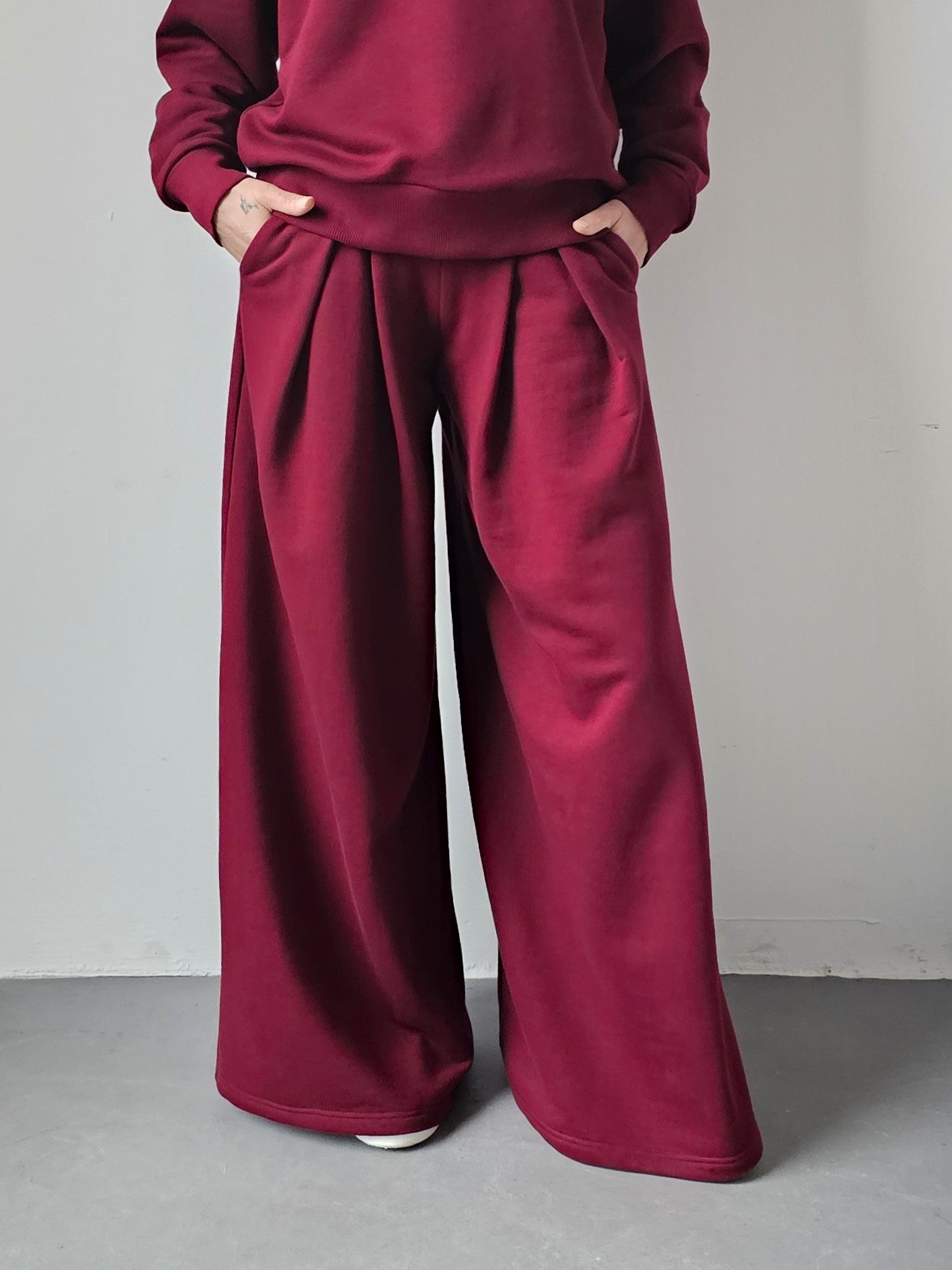 Sarai wygodny komplet bluza i szerokie spodnie z zakładkami