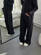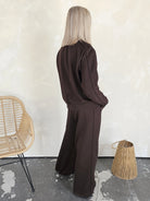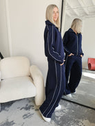 - OPIS PRODUKTU- Komfortowy komplet uszyty z naszego sygnowanego materiału superSOFT™. Komplet obejmuje luźną i w całości rozpinaną, bardzo wygodną bluzę oraz spodnie o luźnym kroju z szerokimi nogawkami. Bluza i spodnie z lamówkami.