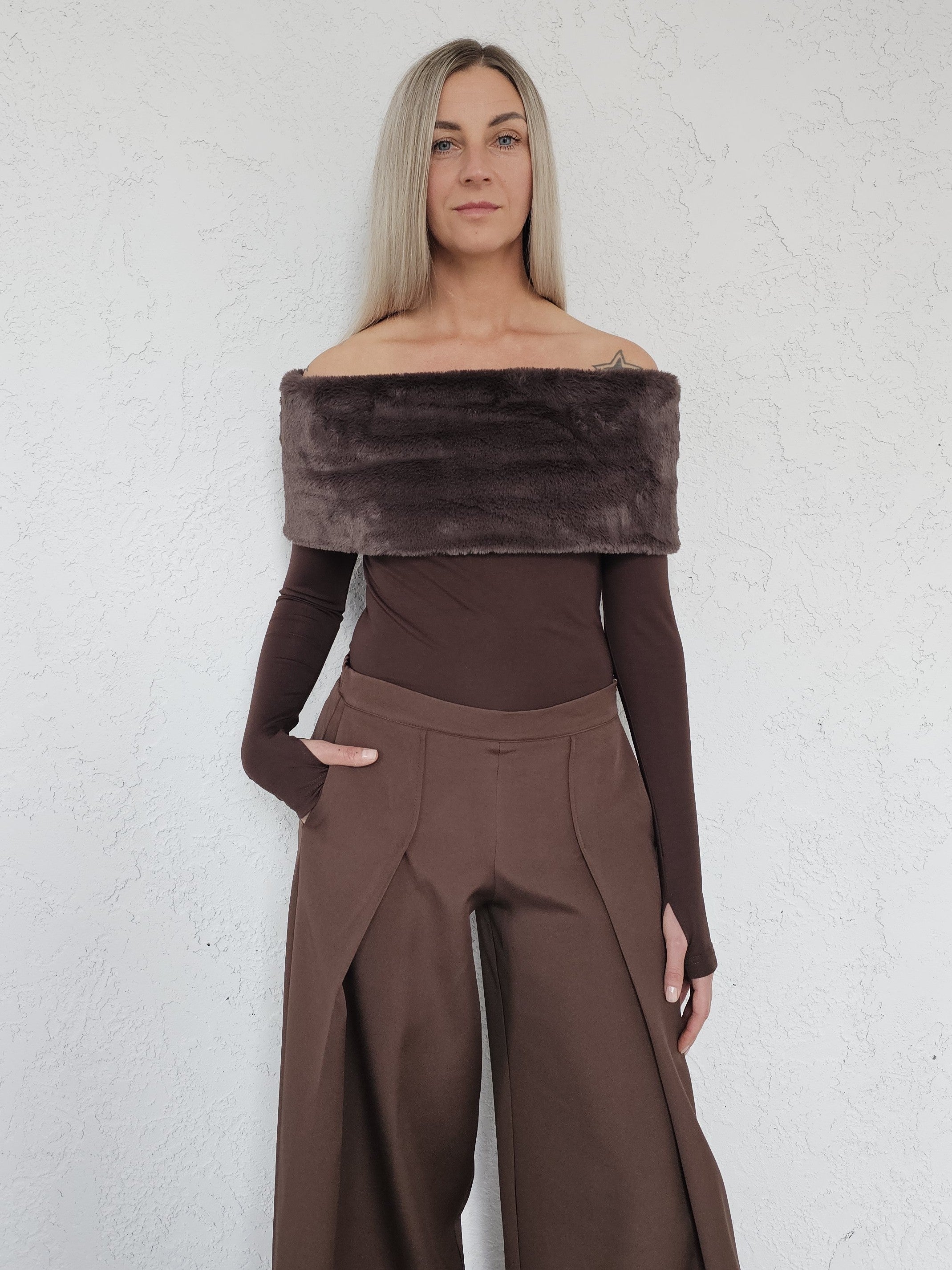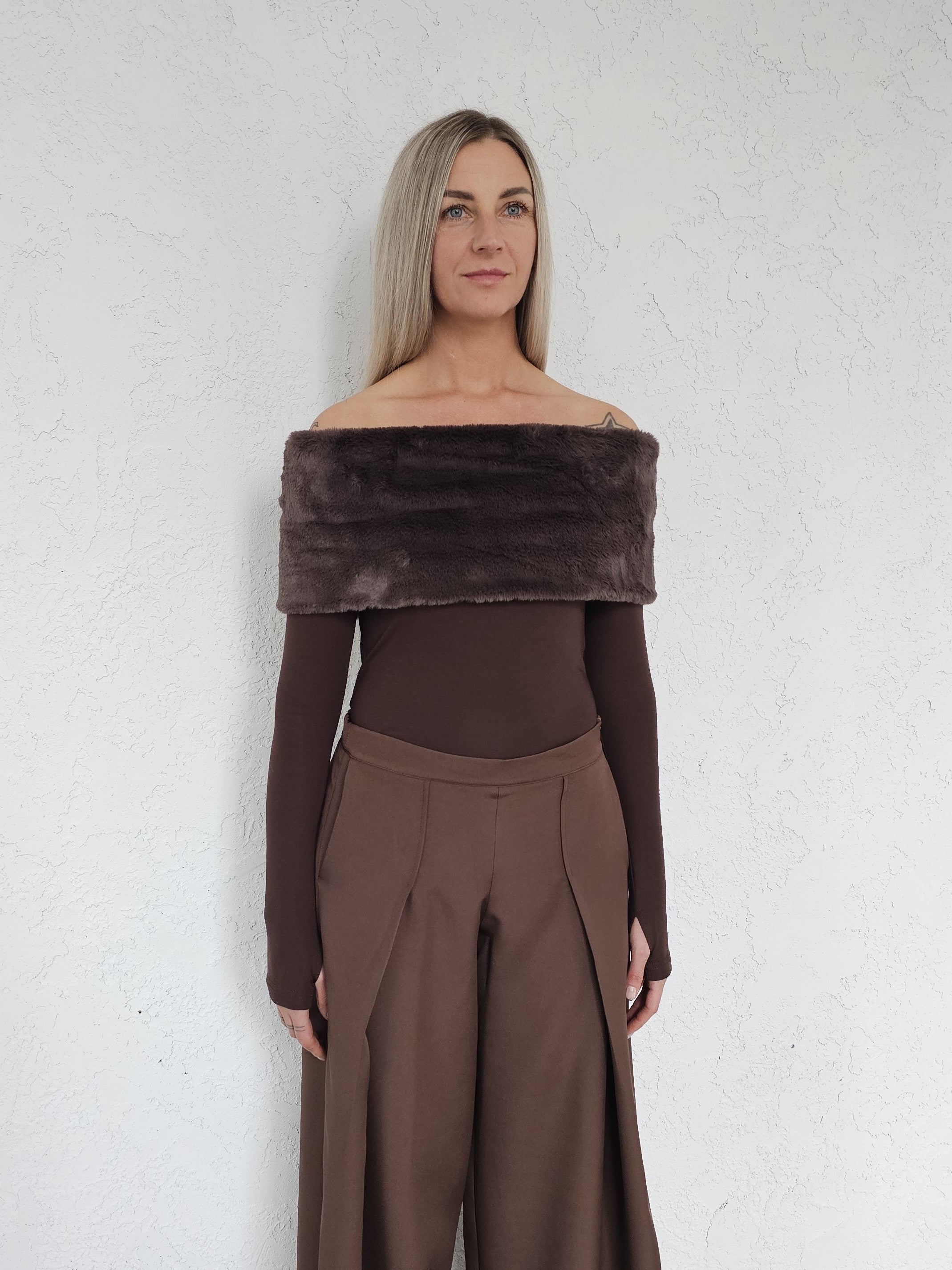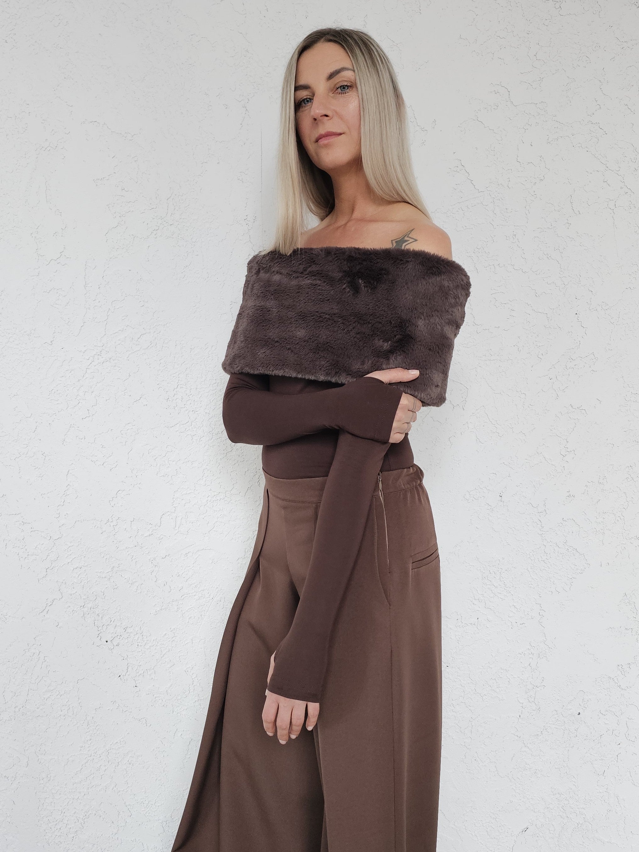 • OPIS PRODUKTU- Damara to top z sztucznym futrem o krótkim włosiu, który jest aksamitny i przyjemny w dotyku. Top pozwala odkryć ramiona. Rękawy mają opcję rękawiczek co widać na zdjęciach. Rękaw można nosić także klasycznie. Top jest elastyczny i dopasowuje się do sylwetki.