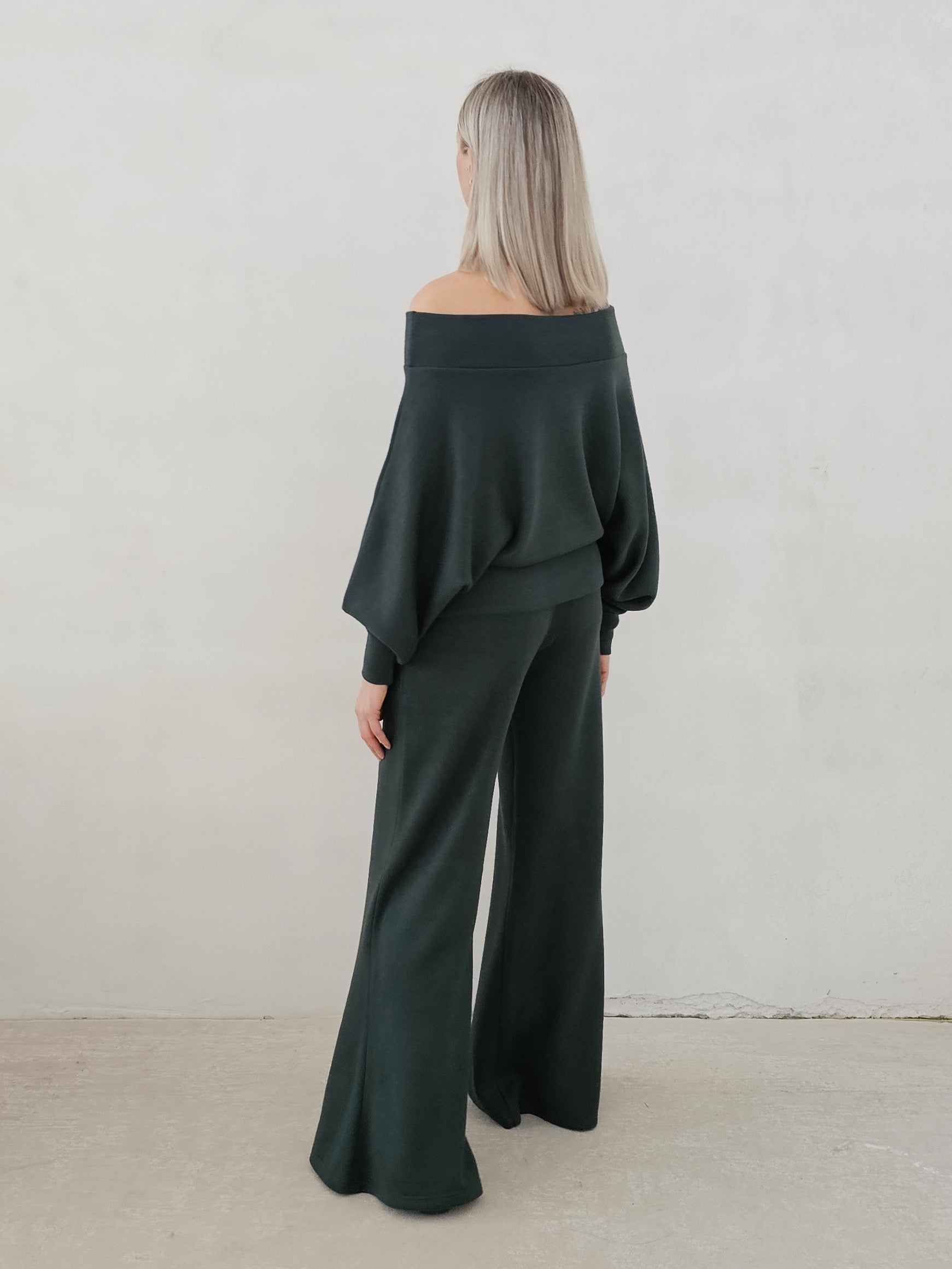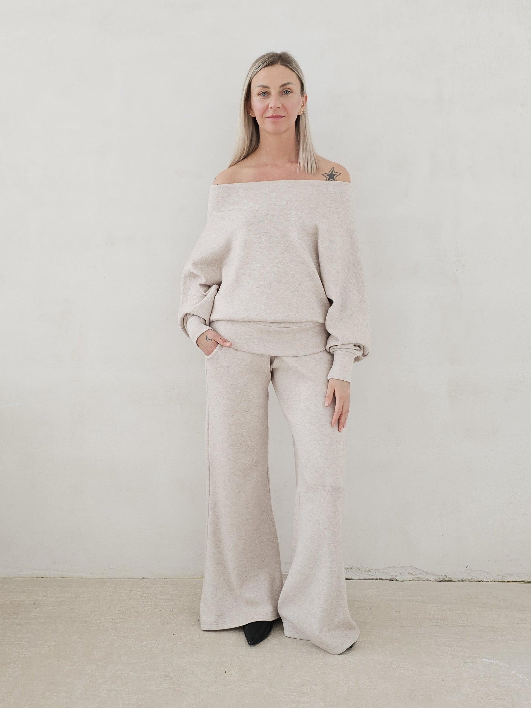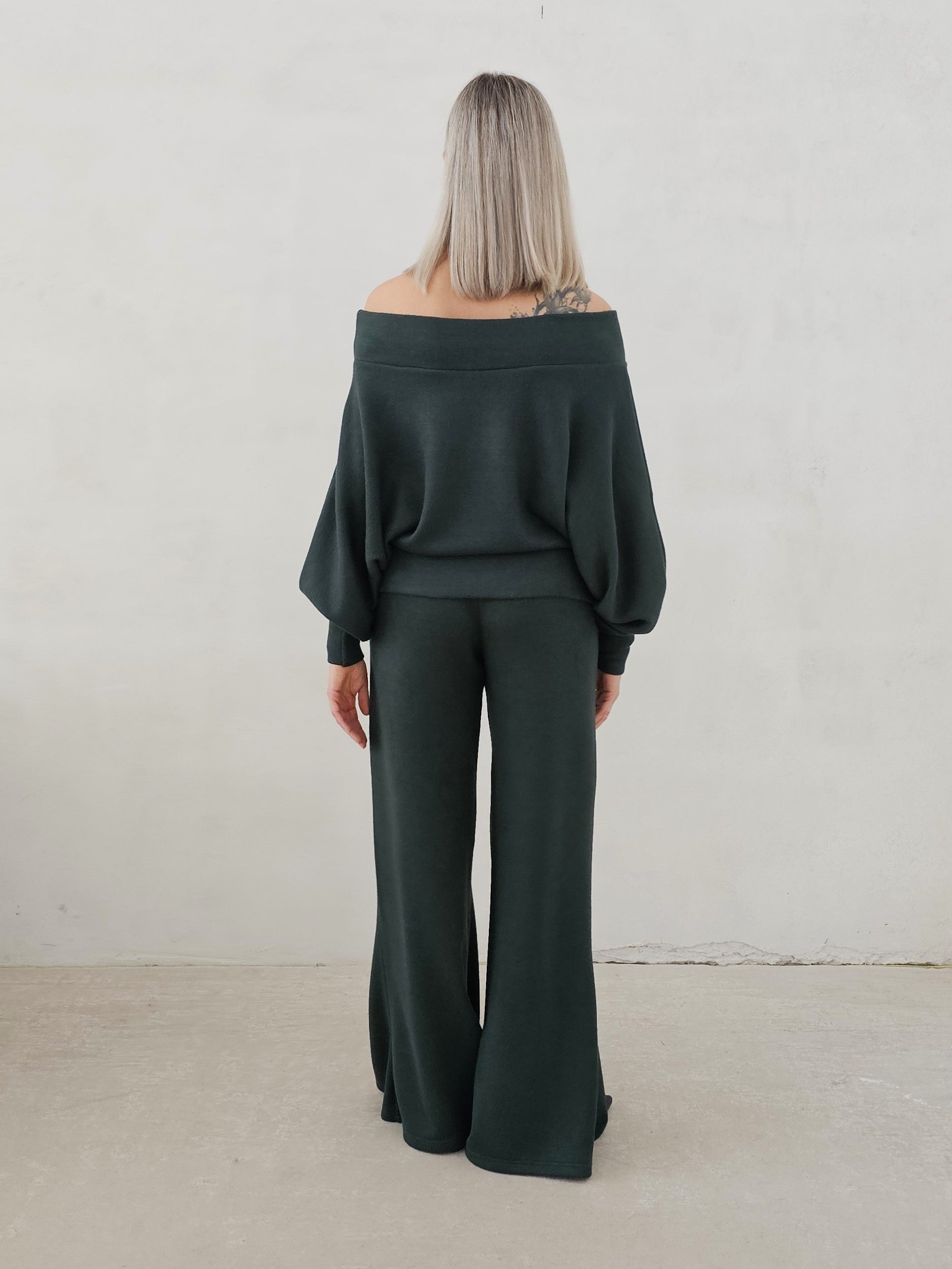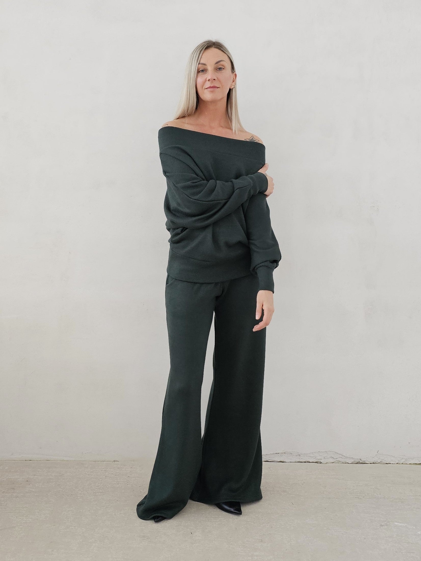 Bellita dzianinowy komplet dzwony i bluzka opadające ramię