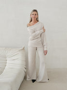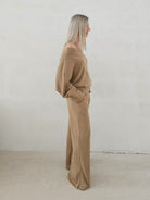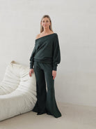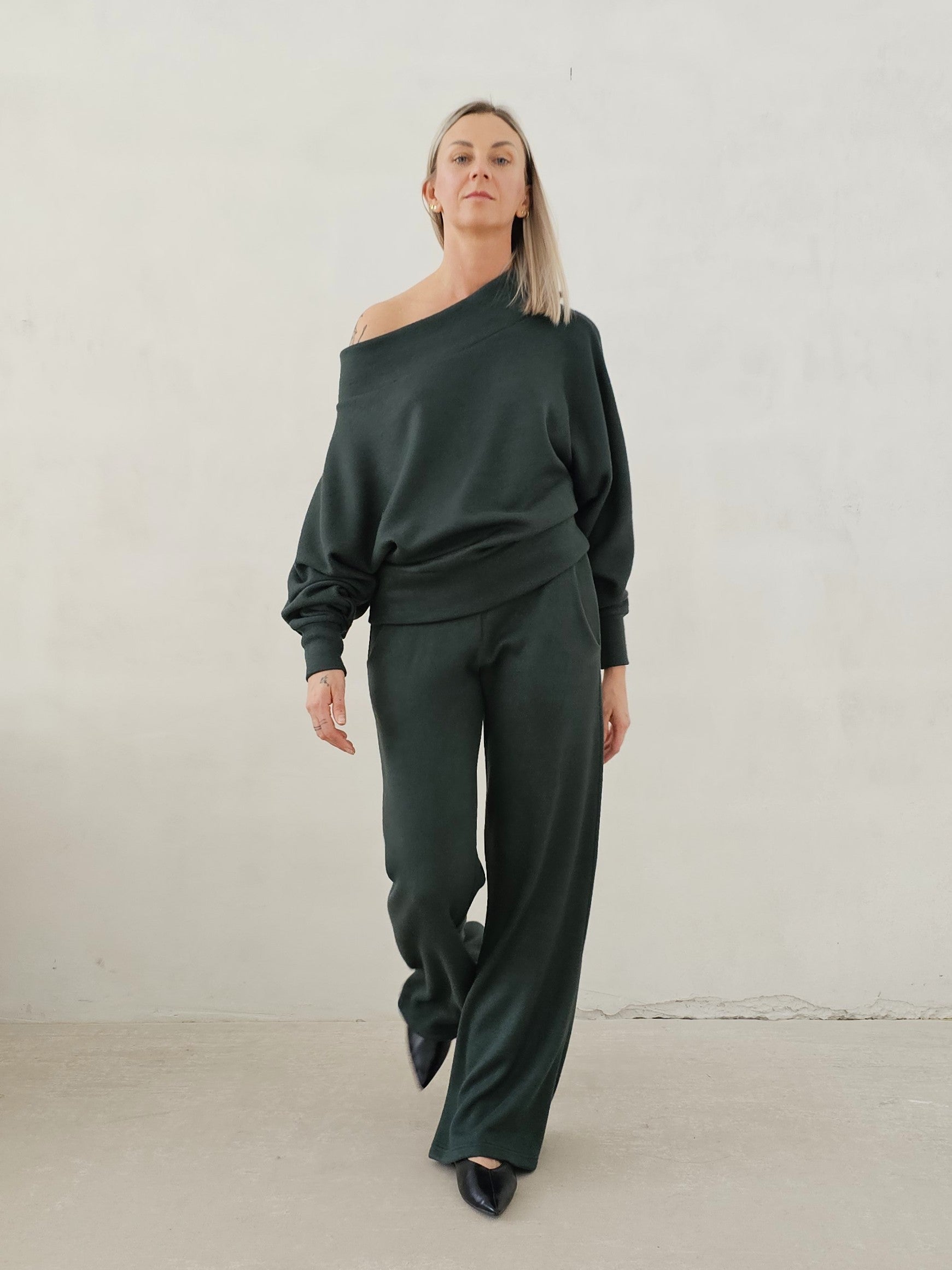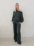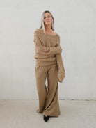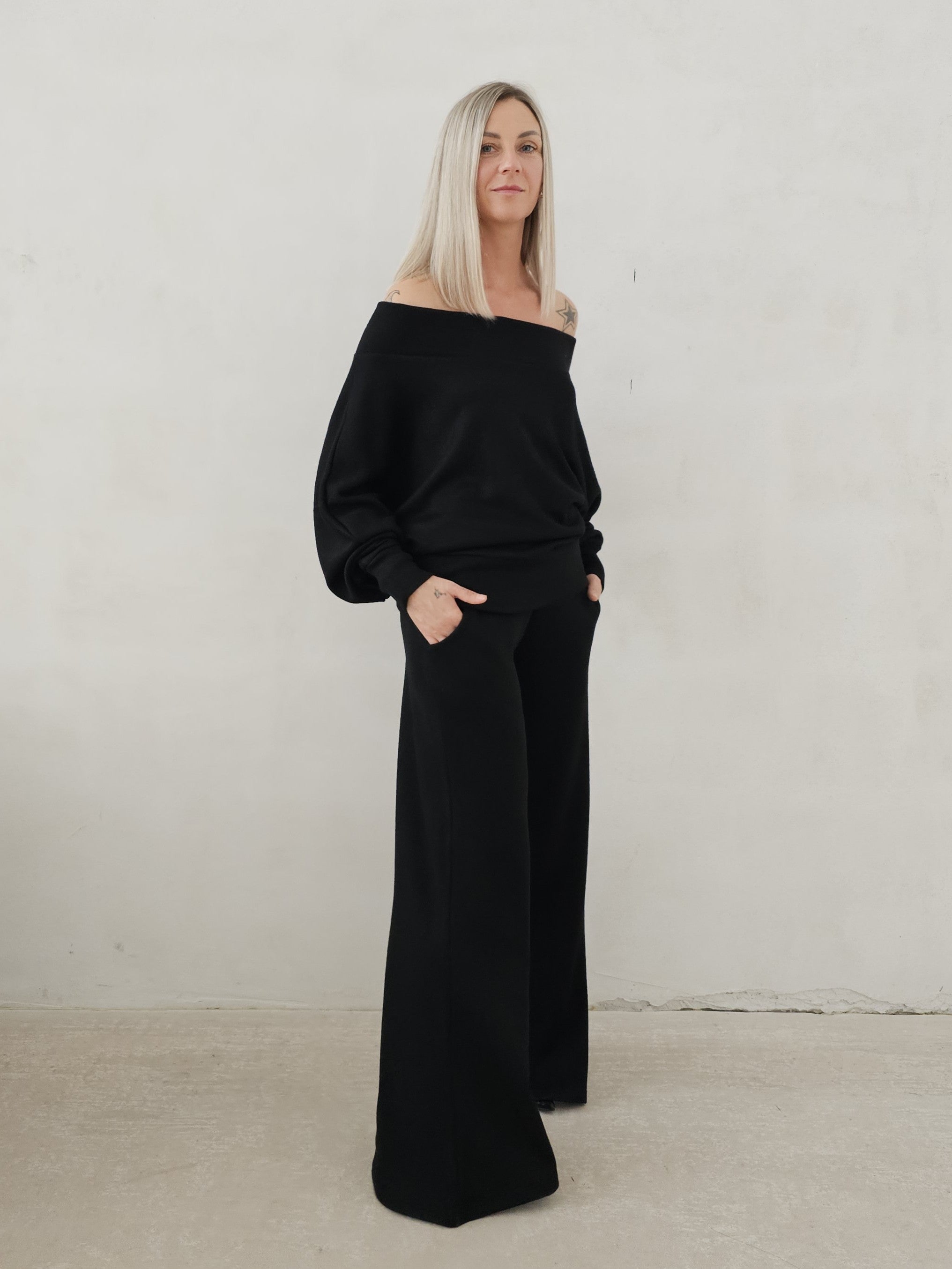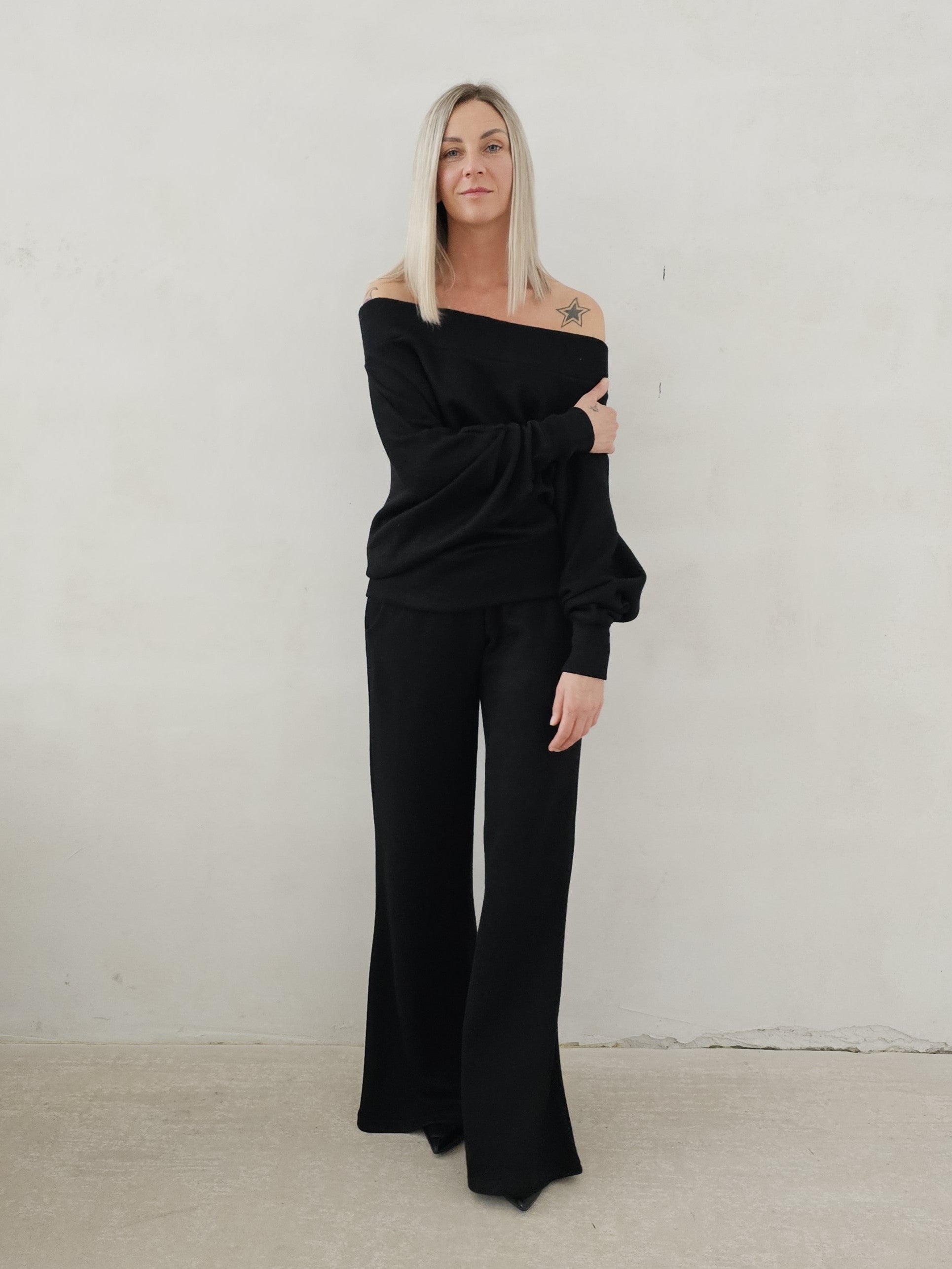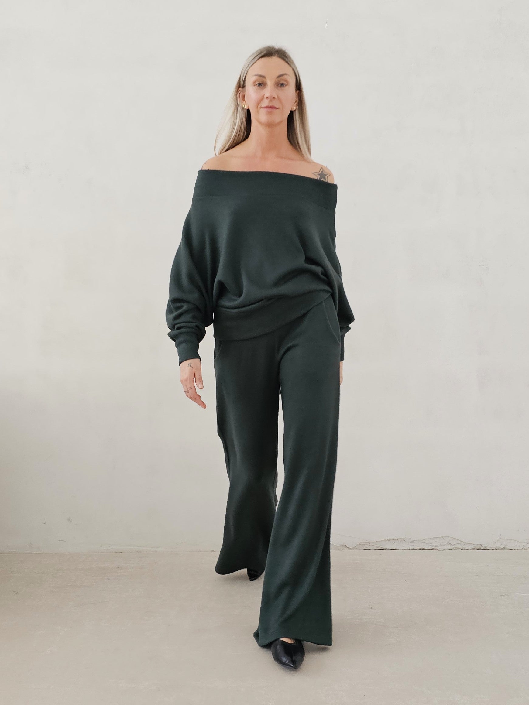 Bellita dzianinowy komplet dzwony i bluzka opadające ramię