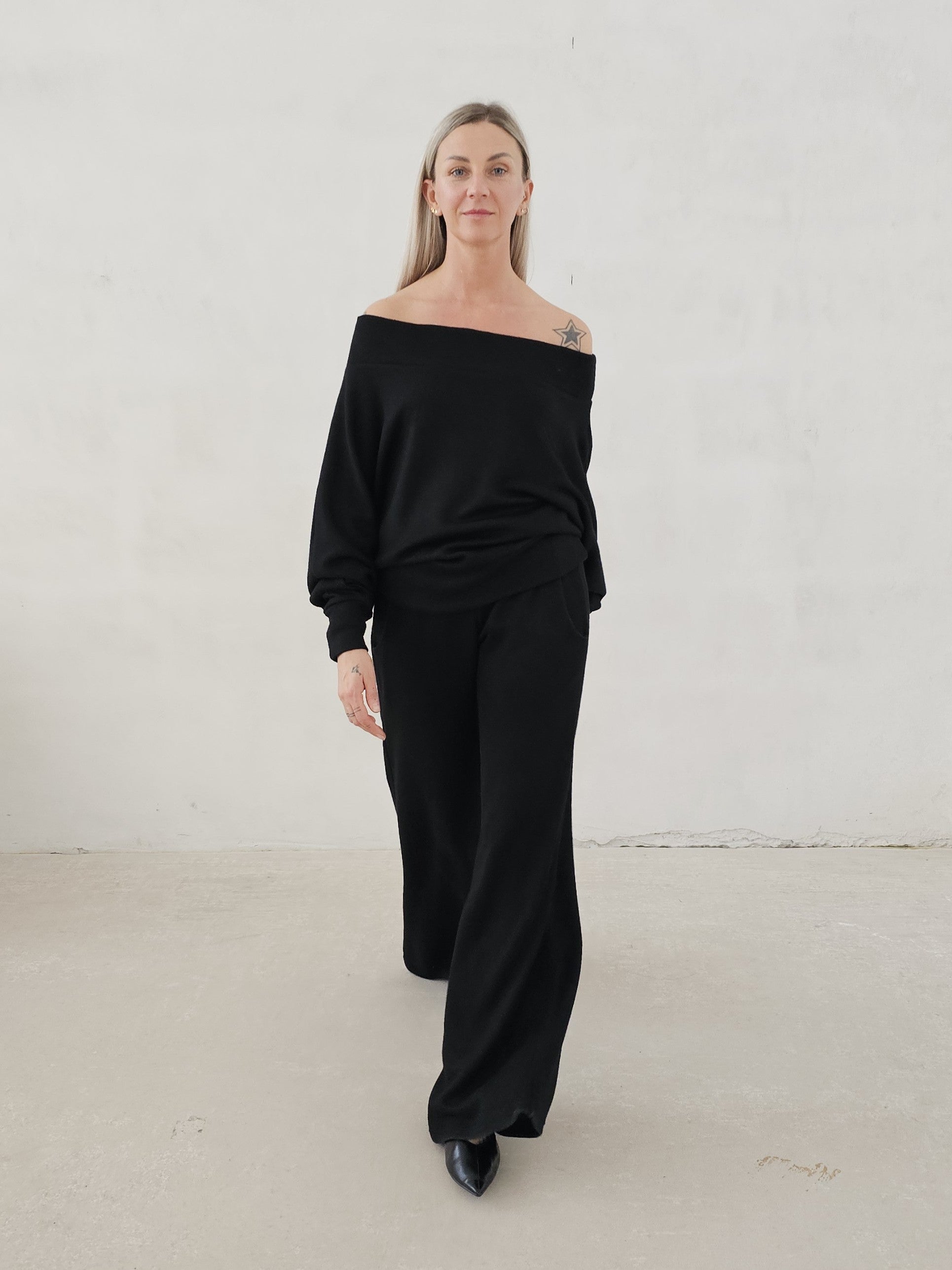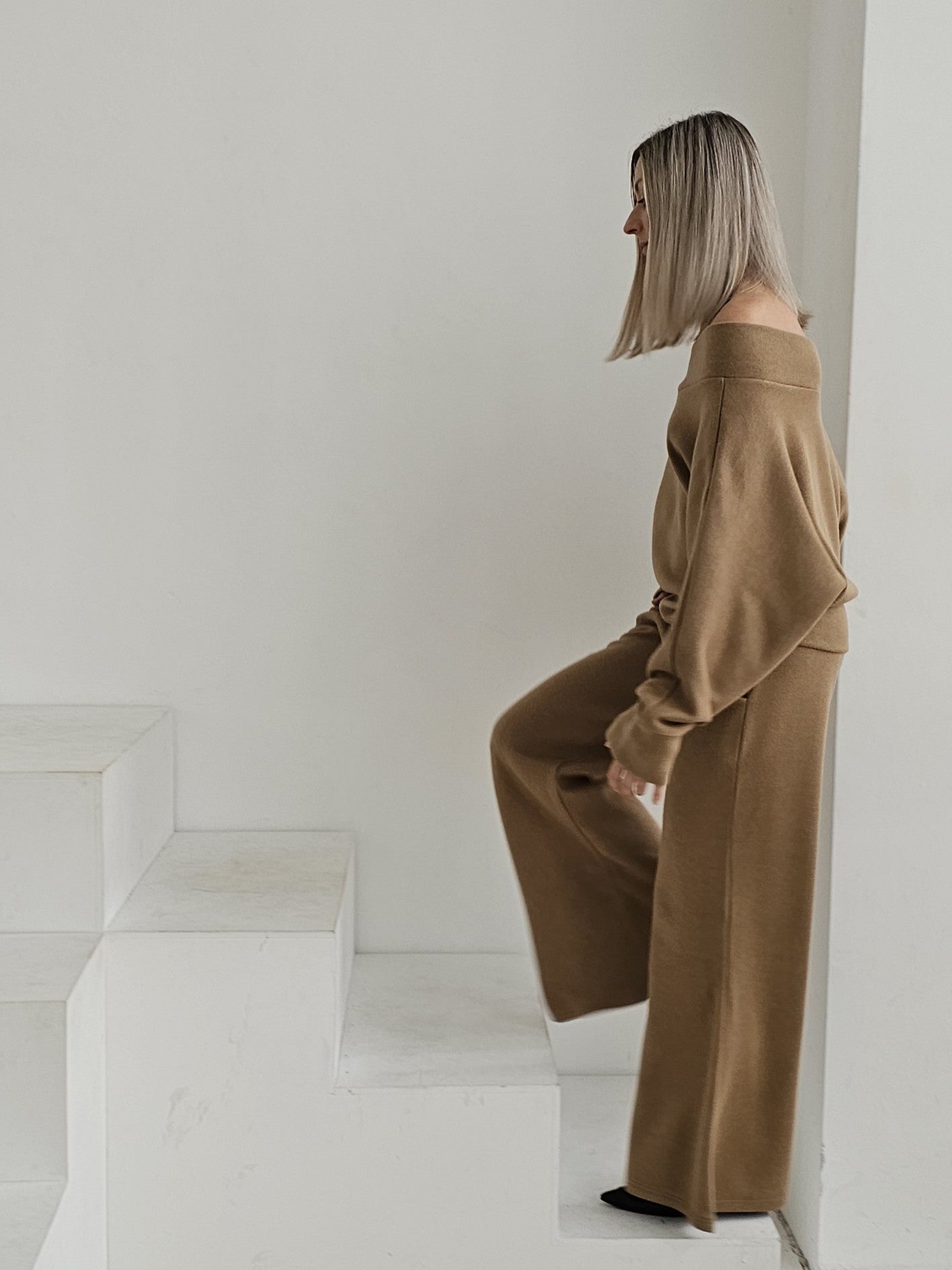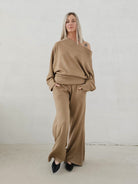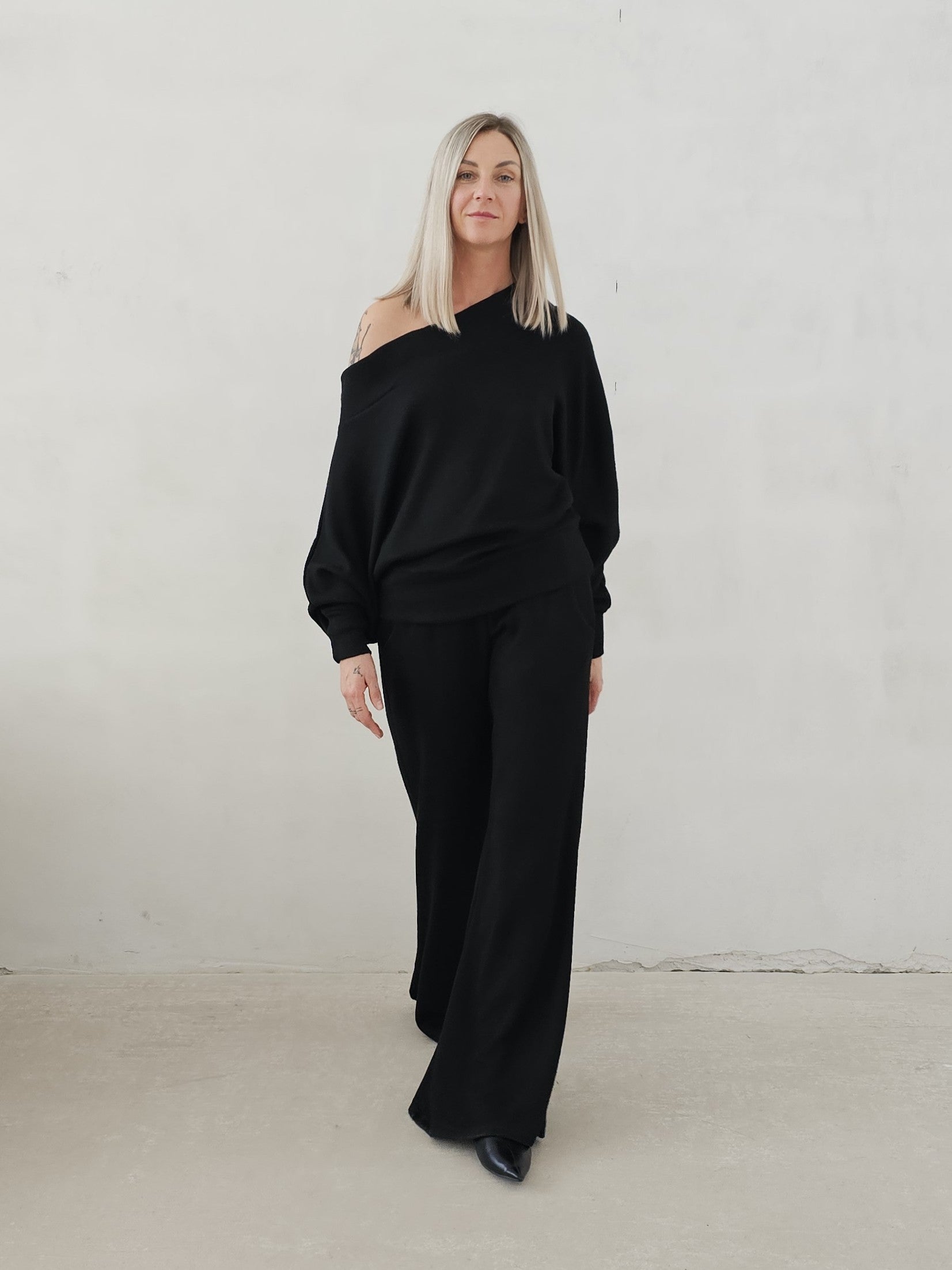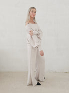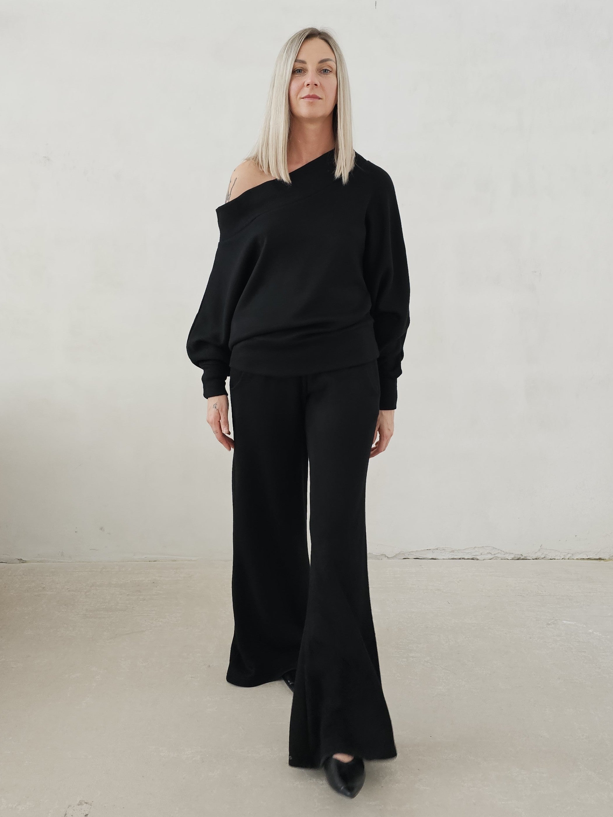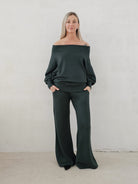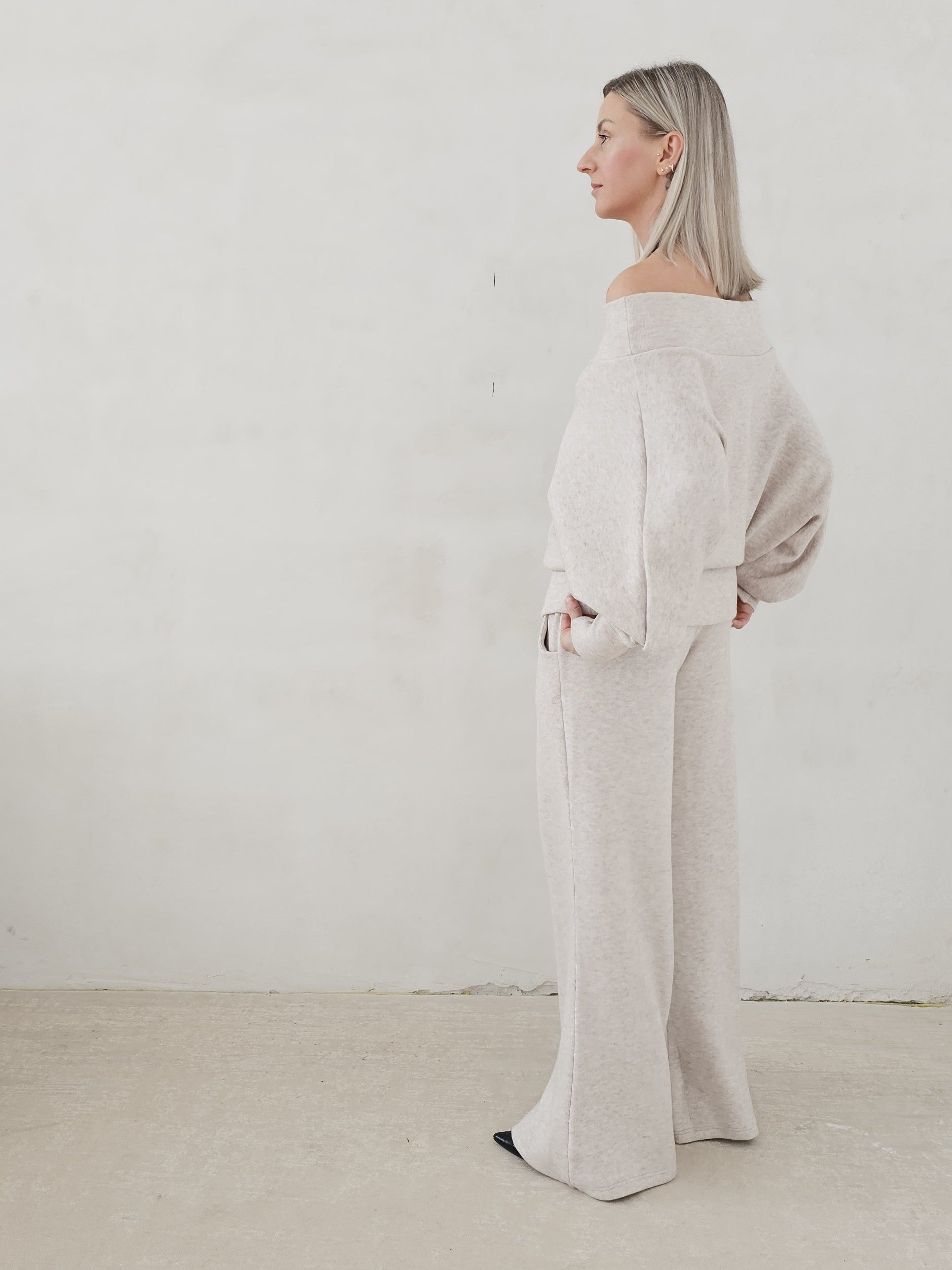 Bellita dzianinowy komplet dzwony i bluzka opadające ramię
