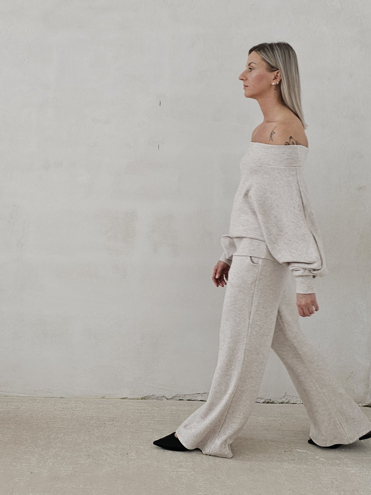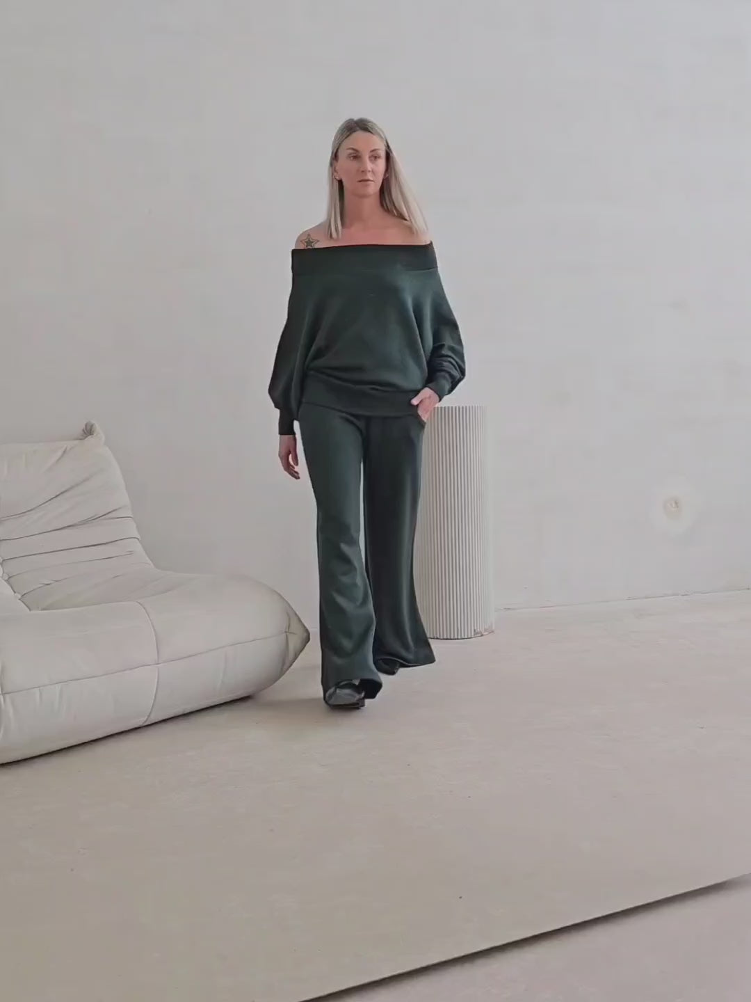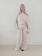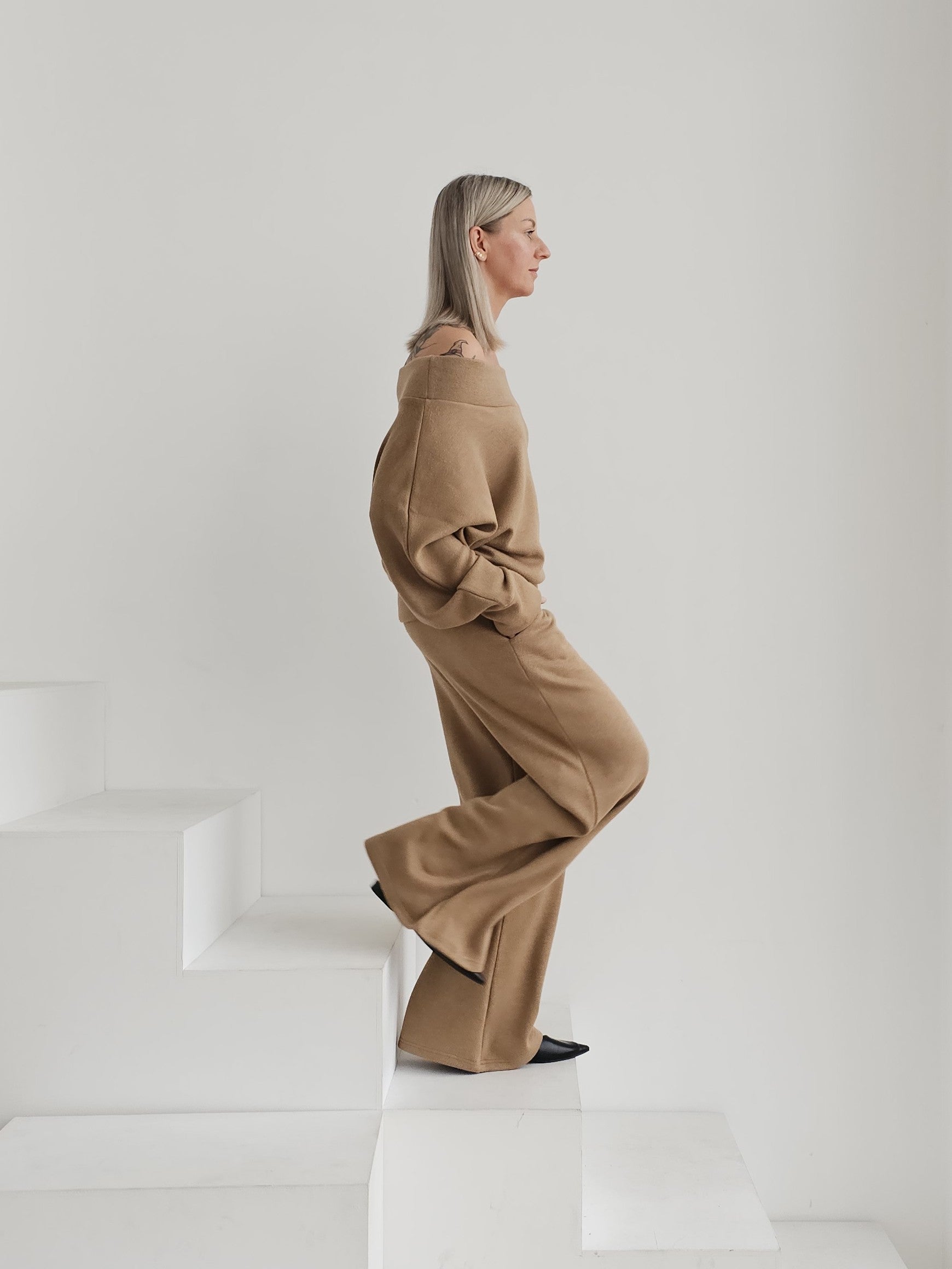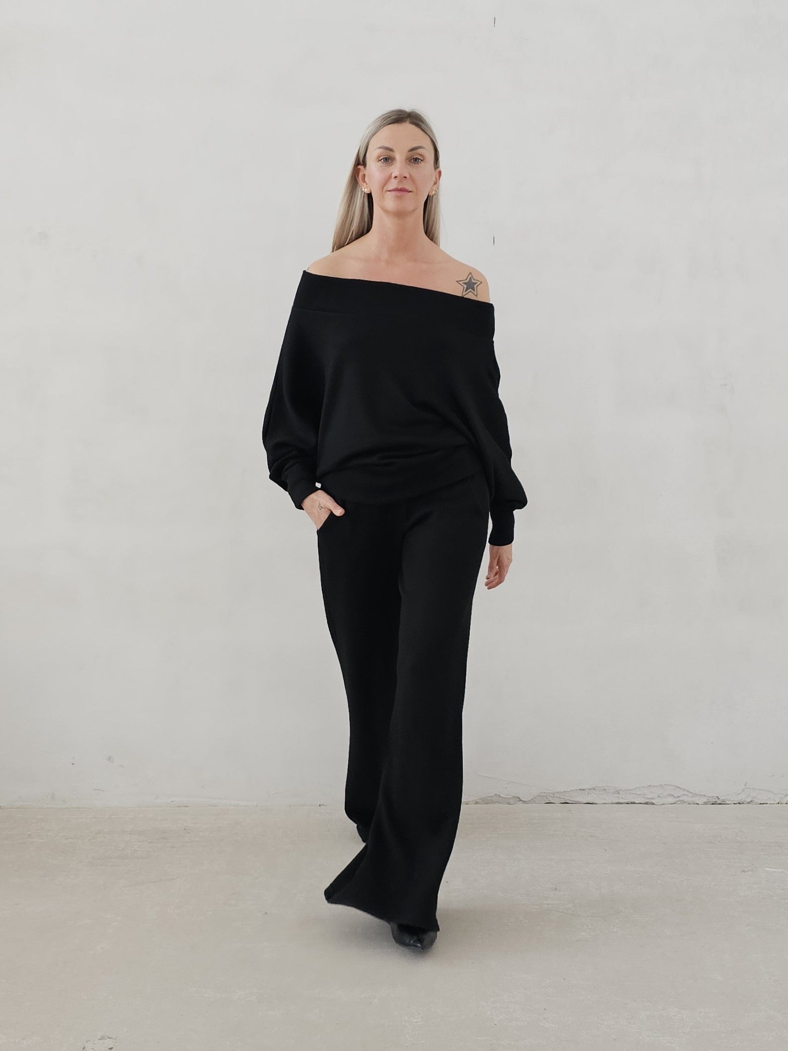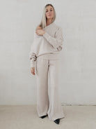Bellita dzianinowy komplet dzwony i bluzka opadające ramię