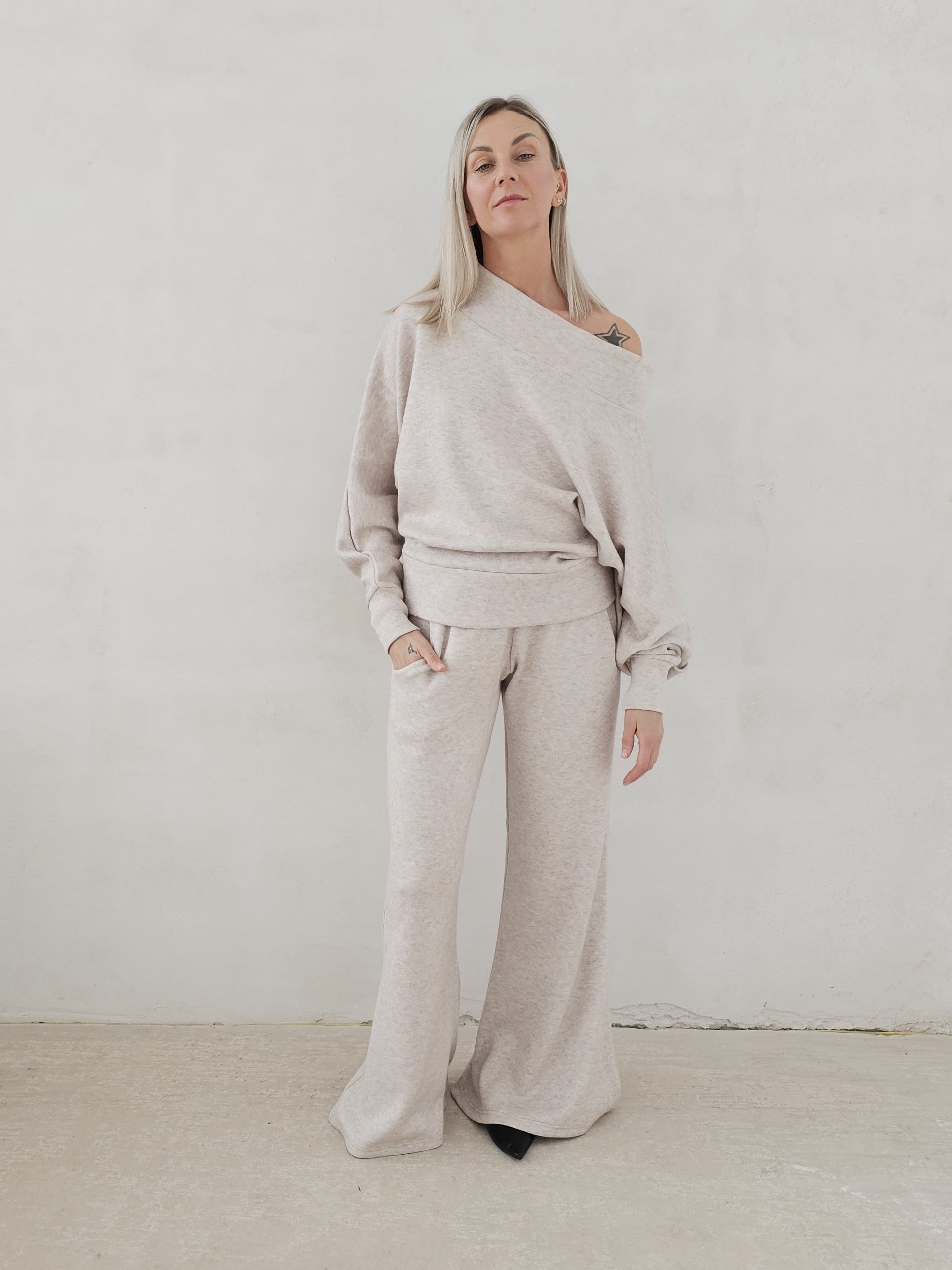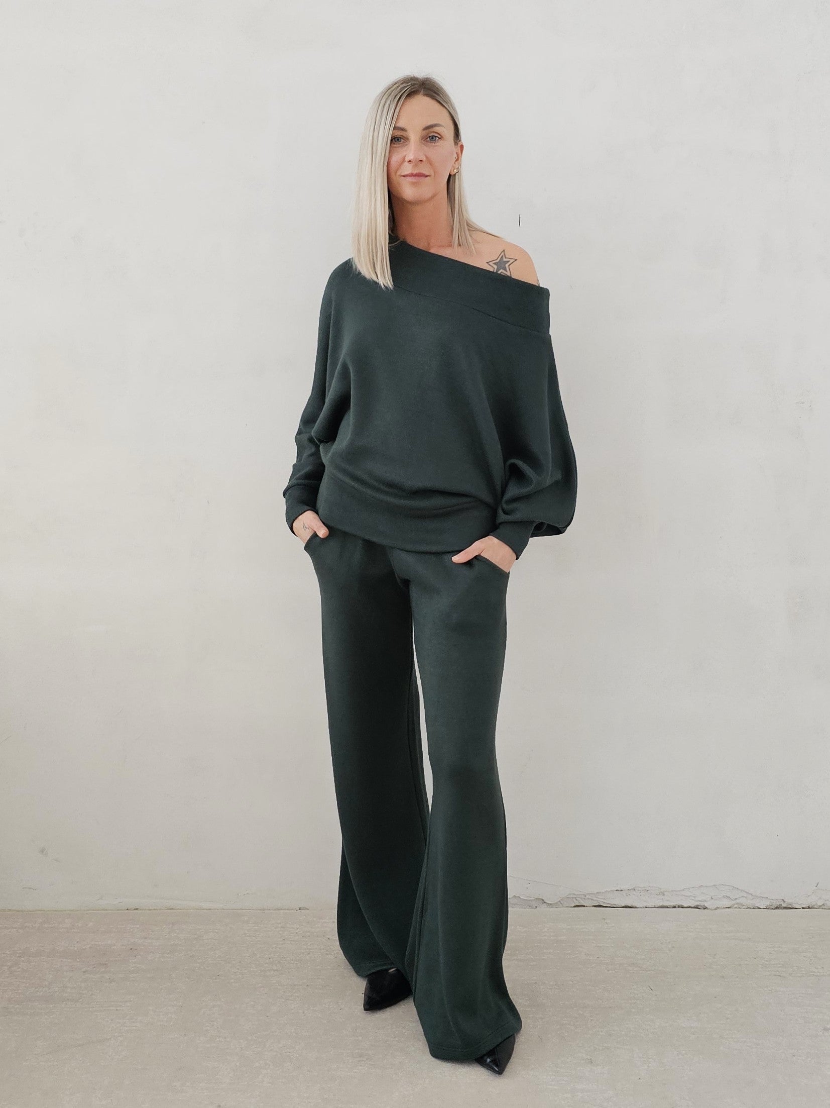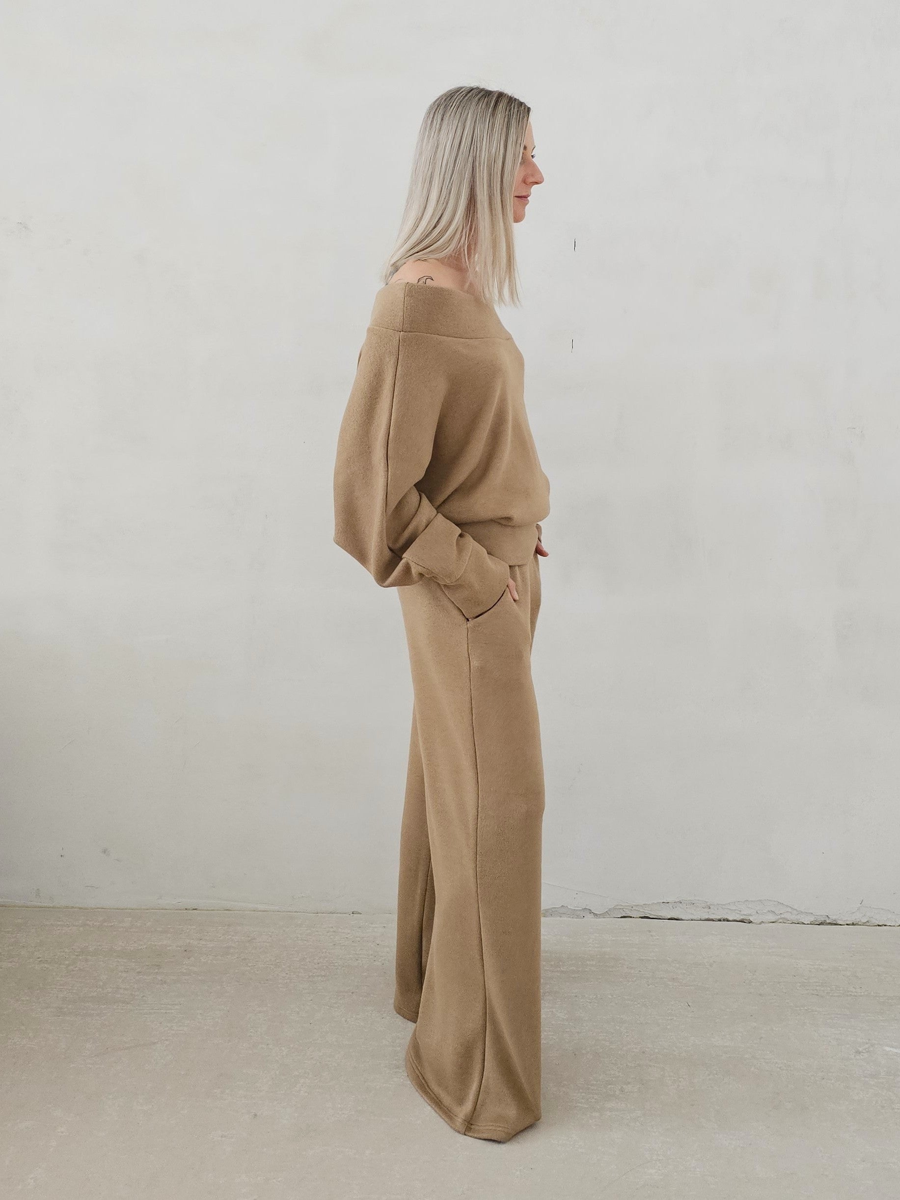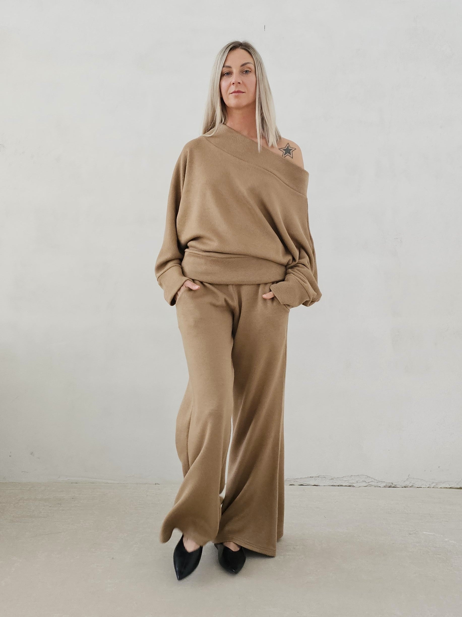 • OPIS PRODUKTU- Zmysłowy komplet ze swetrowej dzianiny. Oversizowa góra to sweter z opadającym ramieniem z lekko taliowanym dołem. Spodnie o fasonie dzwonów. Dzianina jest bardzo miła i mięciutka. Górę można swobodnie stylizować. Spodnie mają gumę w pasie i dopasowują się do sylwetki.
