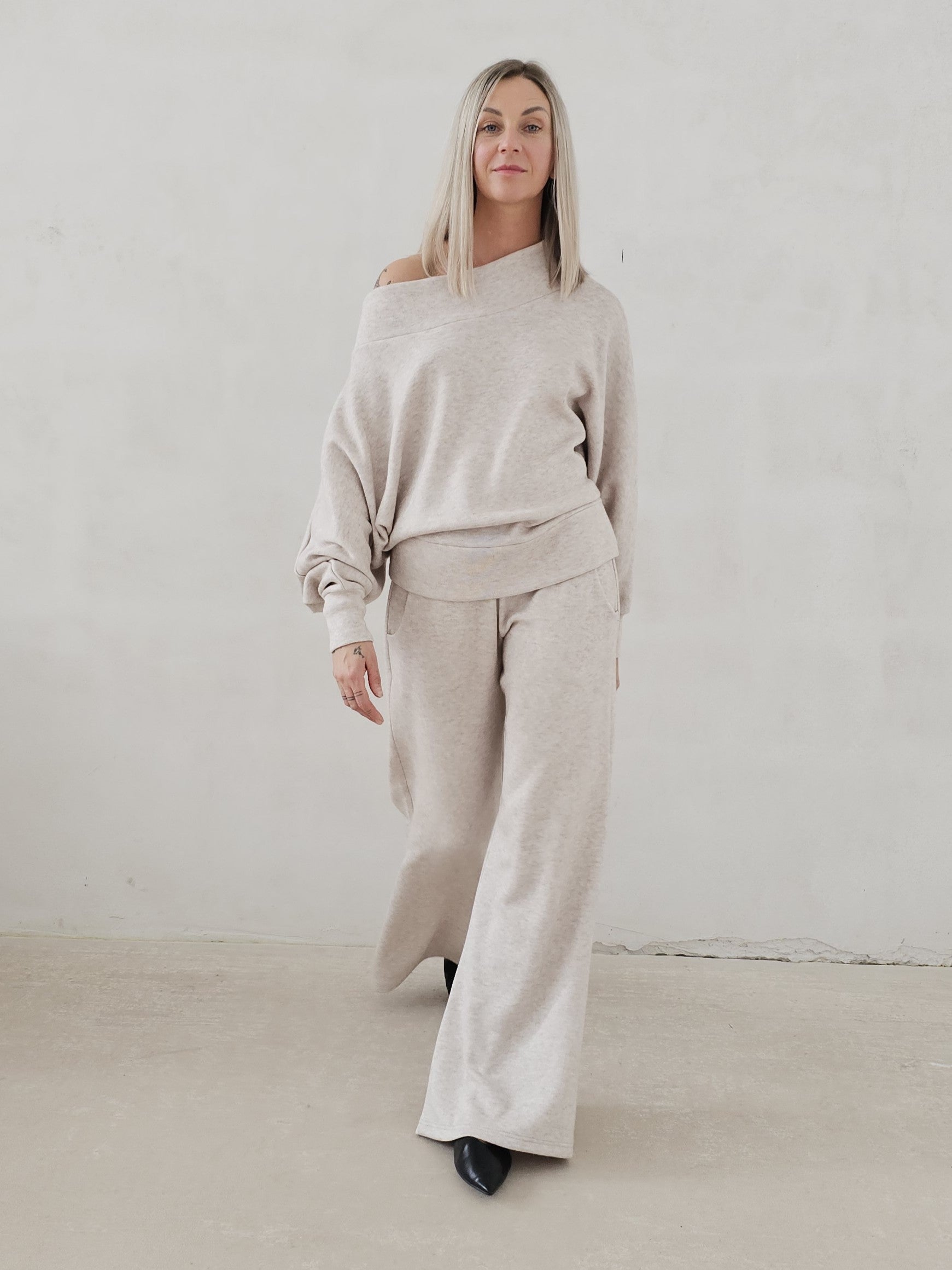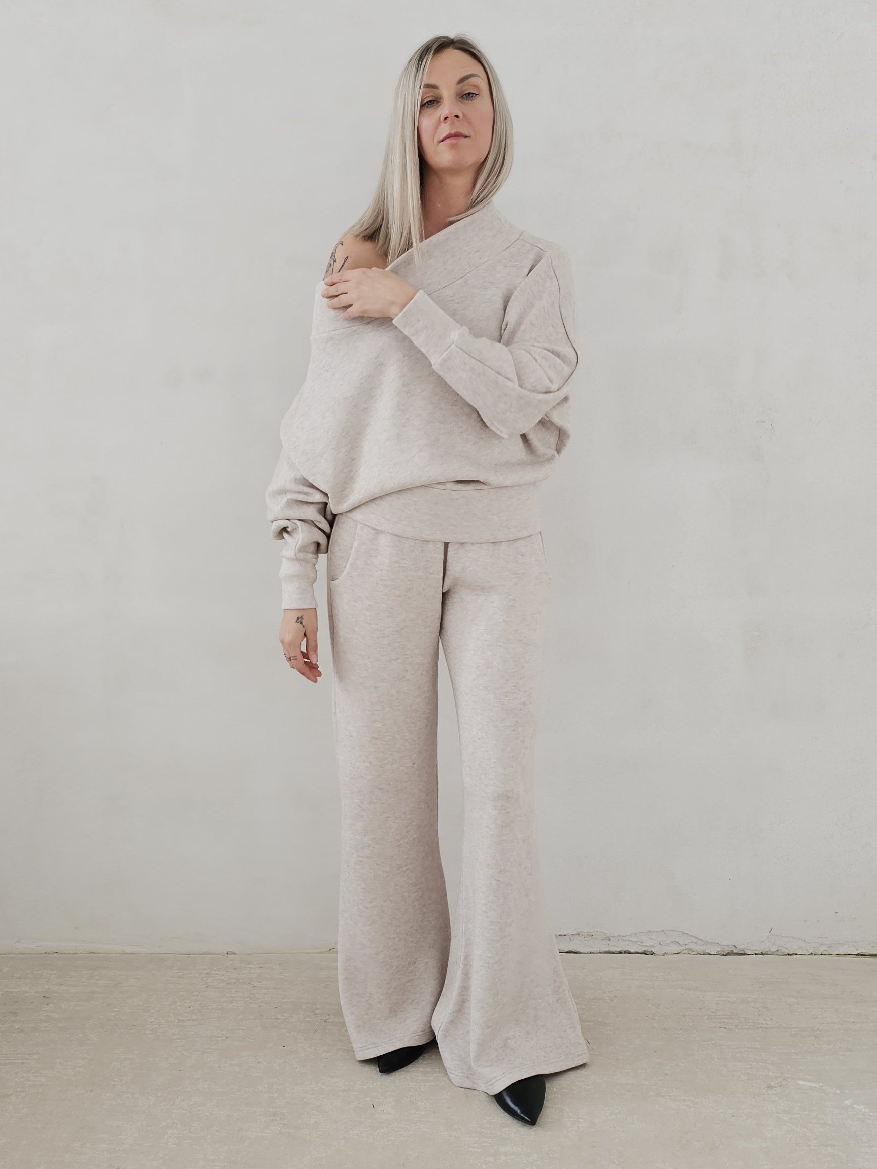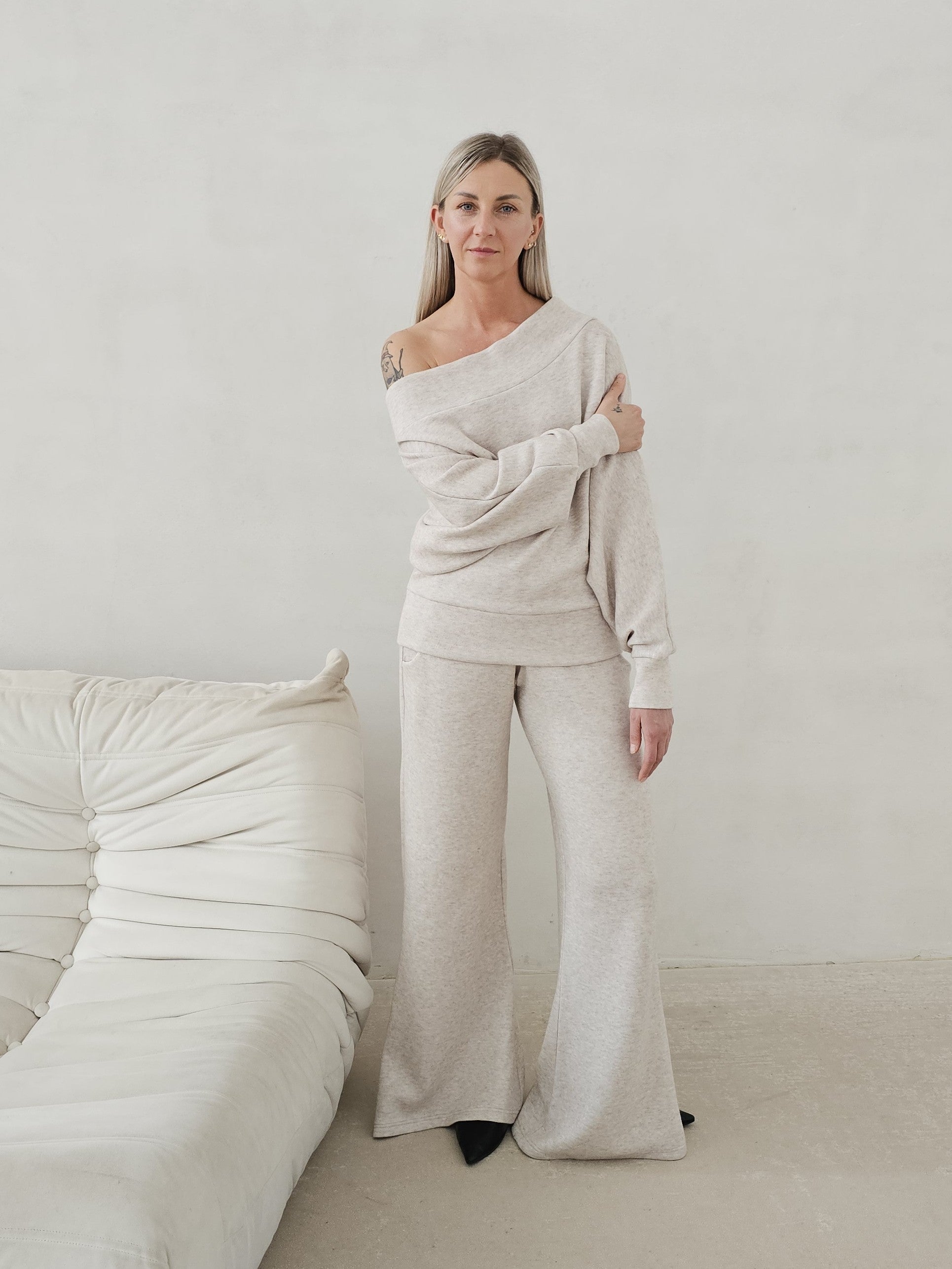 • OPIS PRODUKTU- Zmysłowy komplet ze swetrowej dzianiny. Oversizowa góra to sweter z opadającym ramieniem z lekko taliowanym dołem. Spodnie o fasonie dzwonów. Dzianina jest bardzo miła i mięciutka. Górę można swobodnie stylizować. Spodnie mają gumę w pasie i dopasowują się do sylwetki.