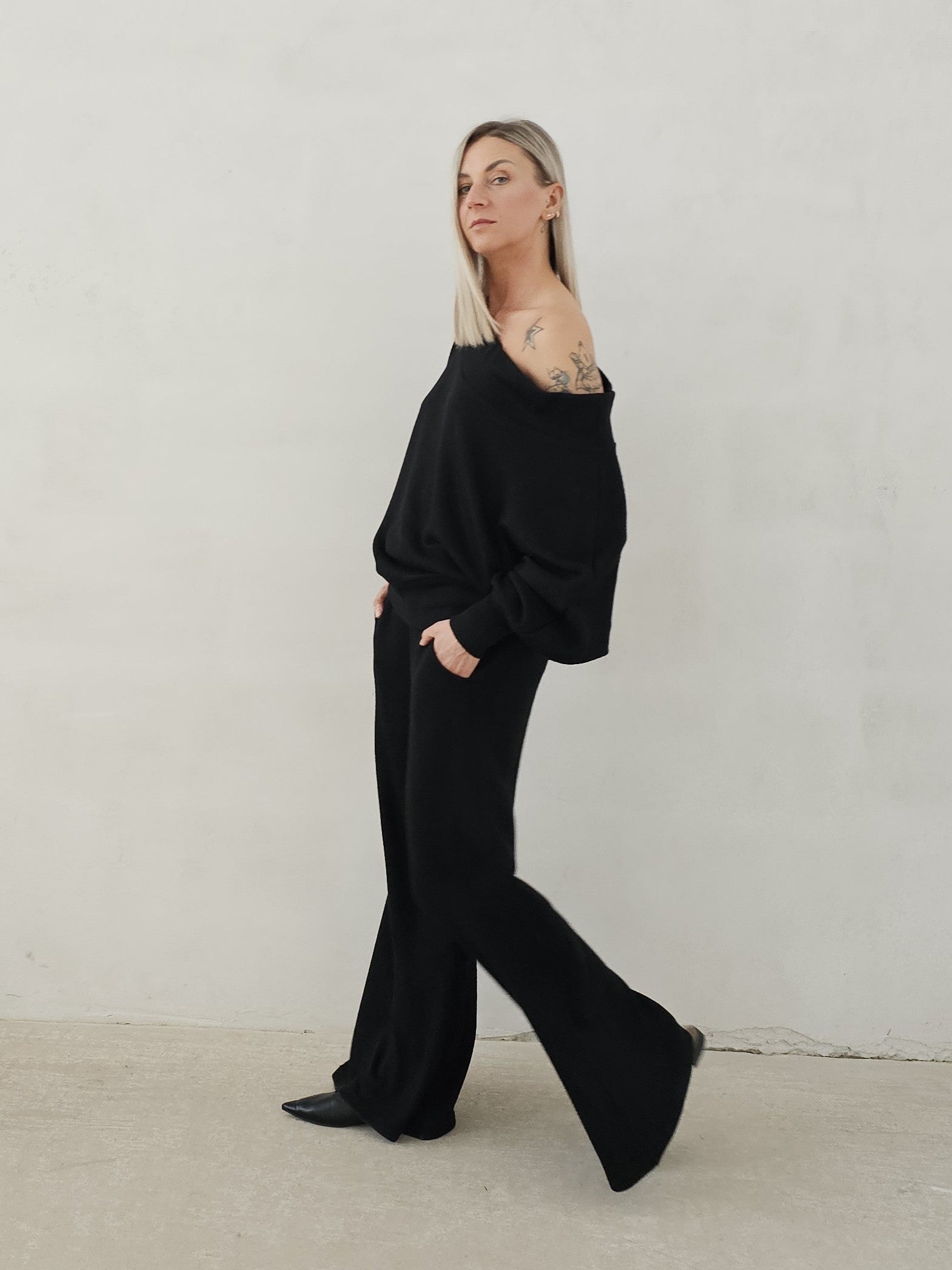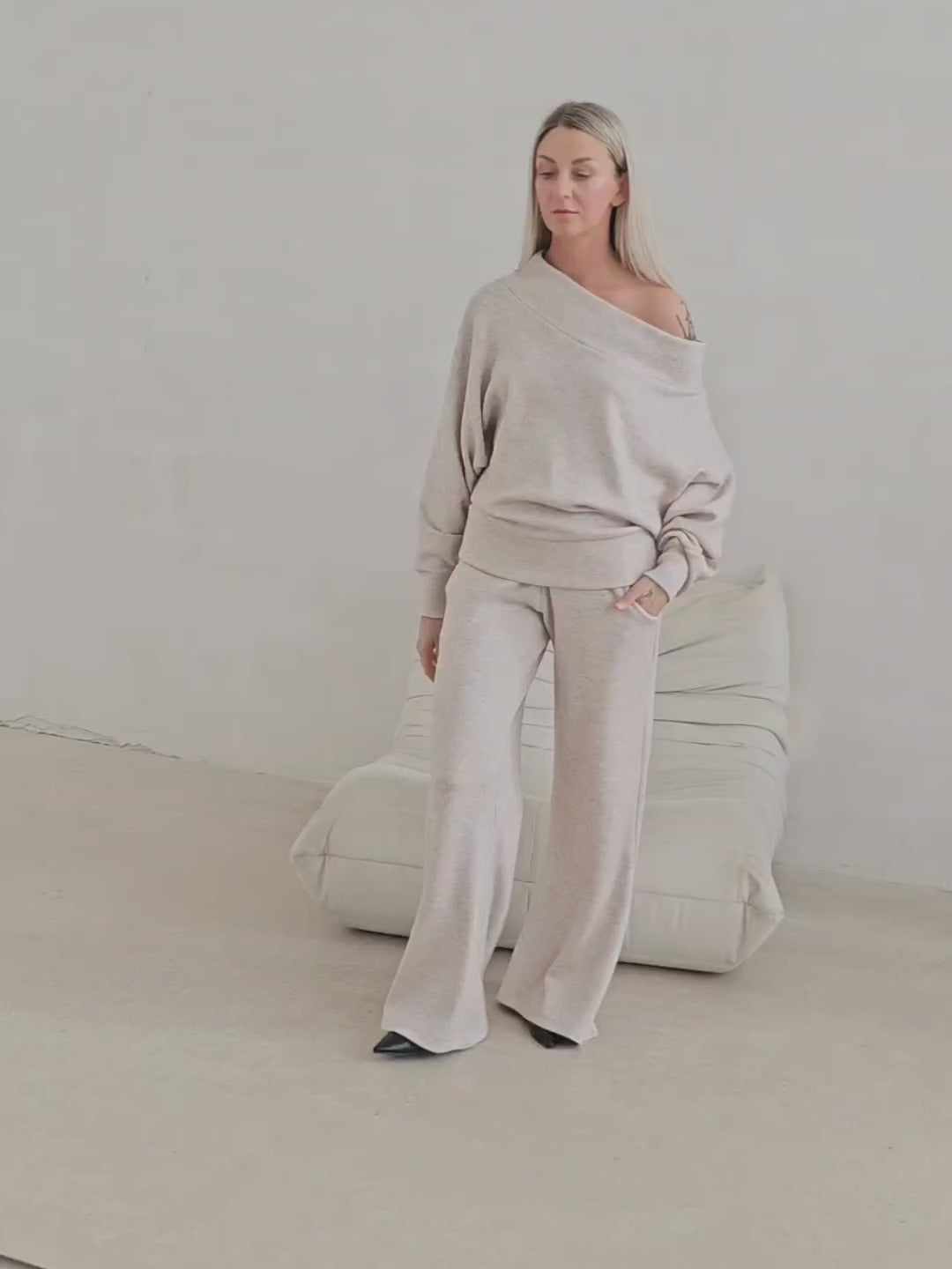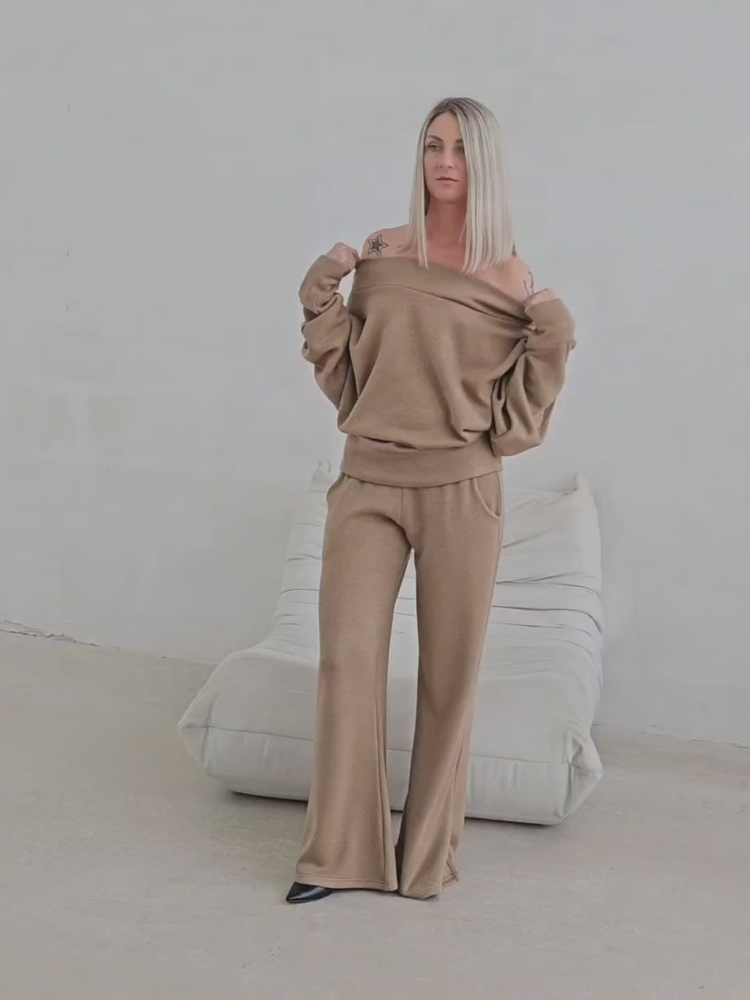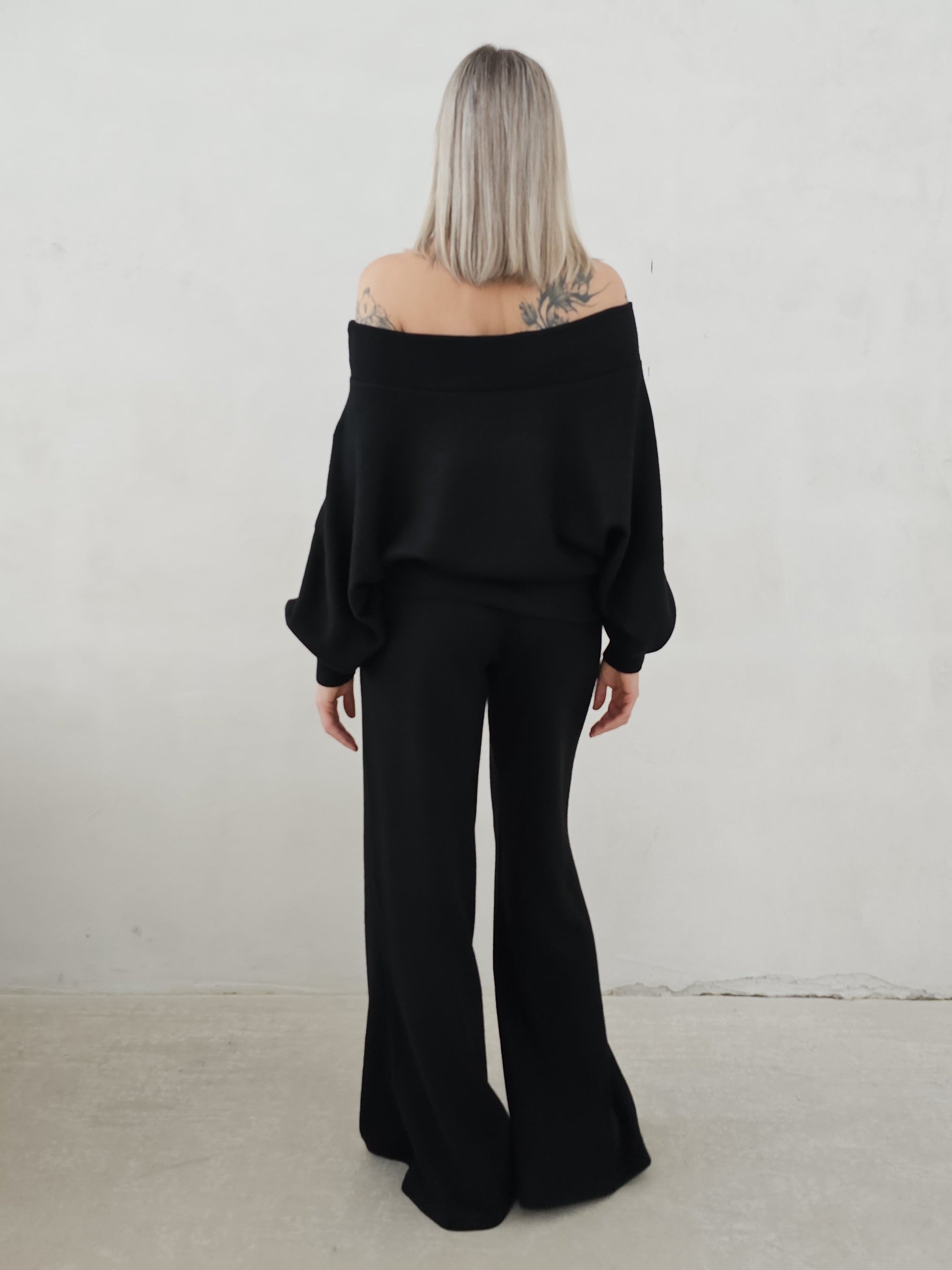 • OPIS PRODUKTU- Zmysłowy komplet ze swetrowej dzianiny. Oversizowa góra to sweter z opadającym ramieniem z lekko taliowanym dołem. Spodnie o fasonie dzwonów. Dzianina jest bardzo miła i mięciutka. Górę można swobodnie stylizować. Spodnie mają gumę w pasie i dopasowują się do sylwetki.