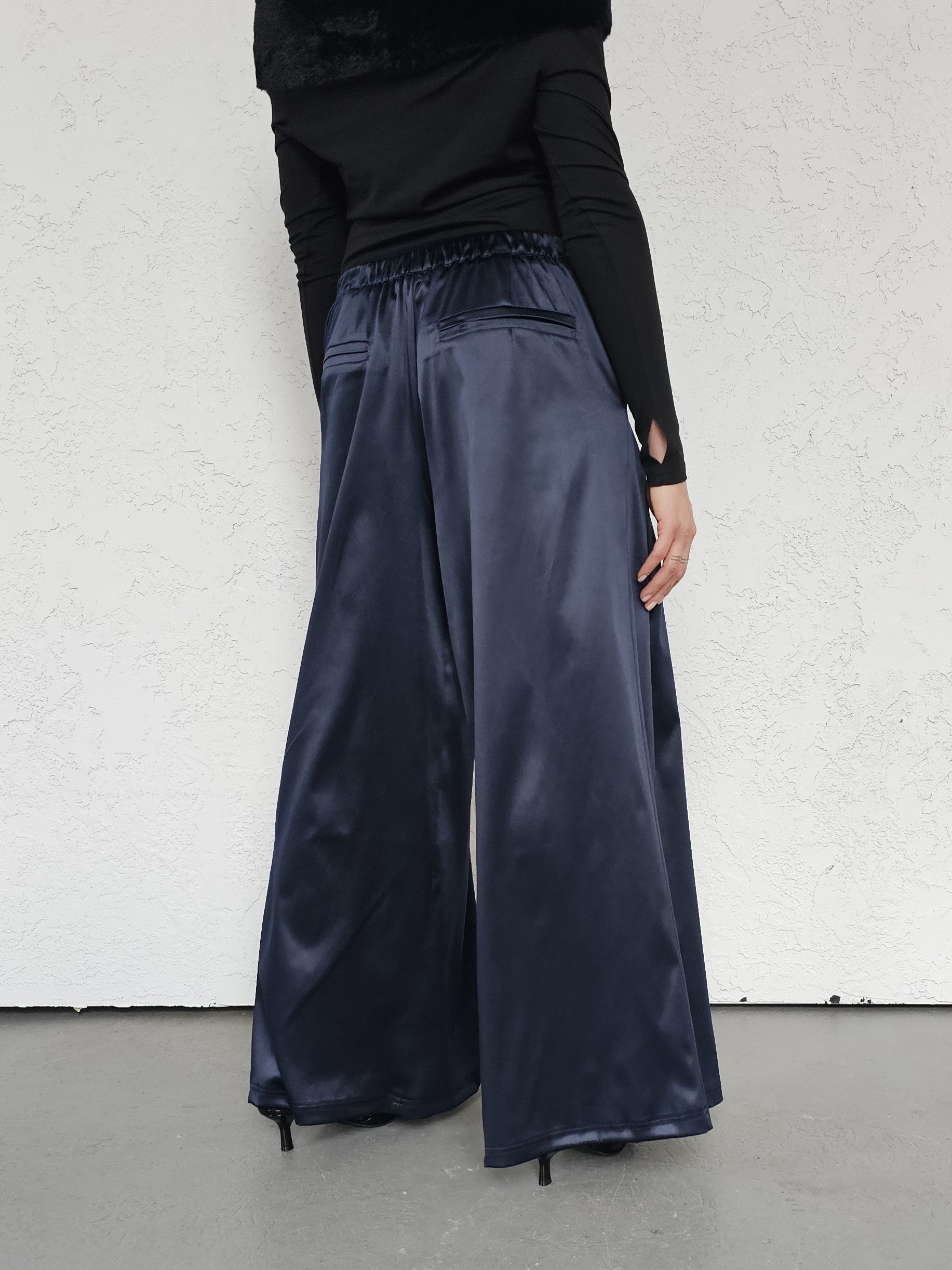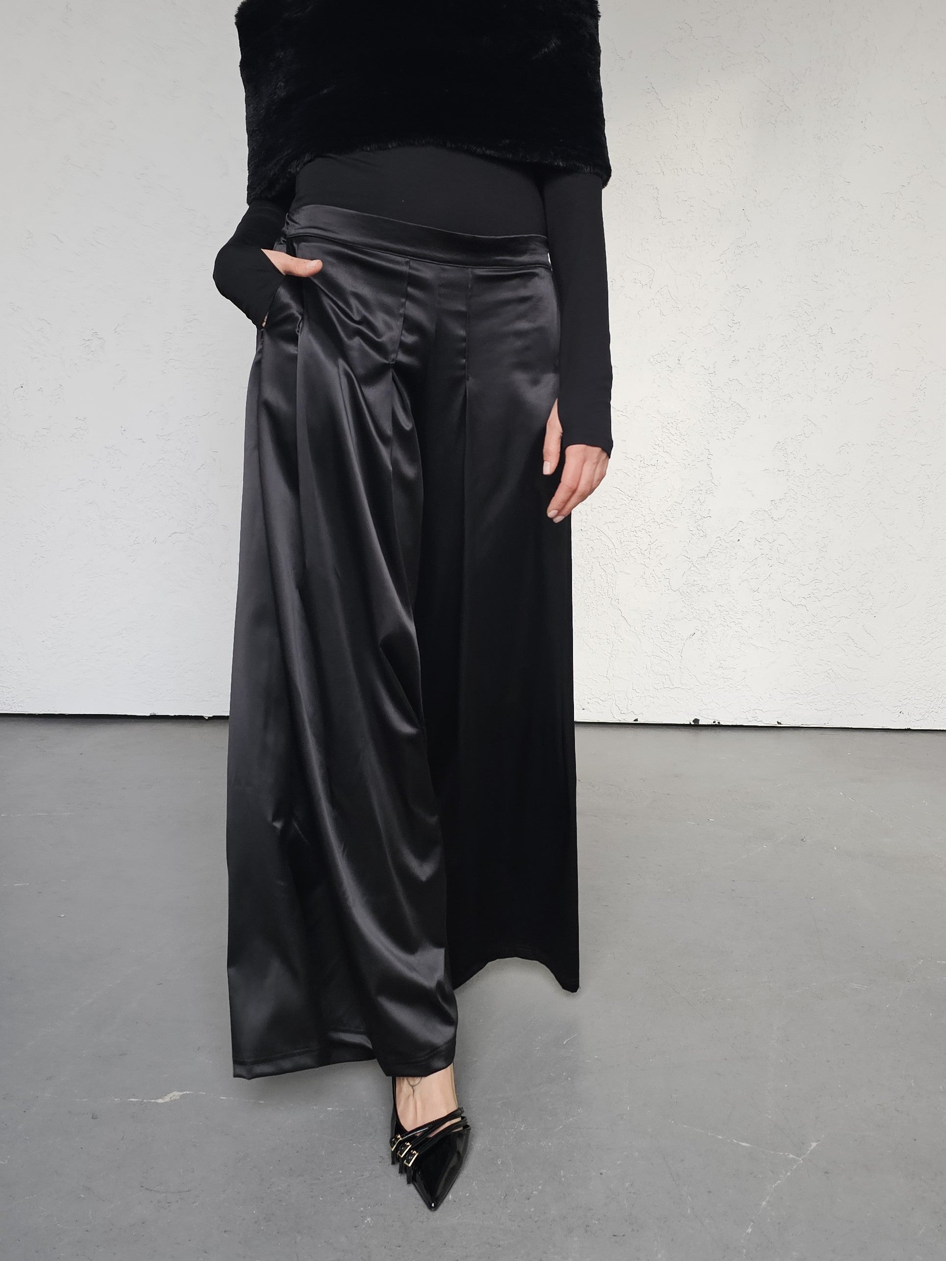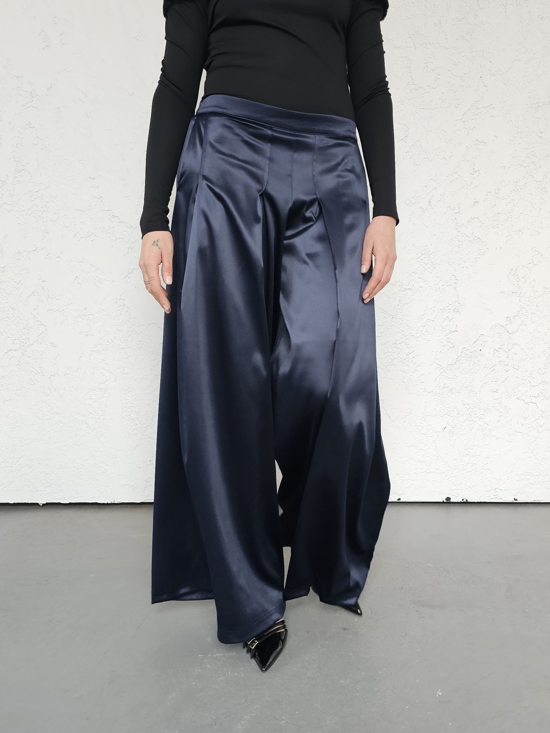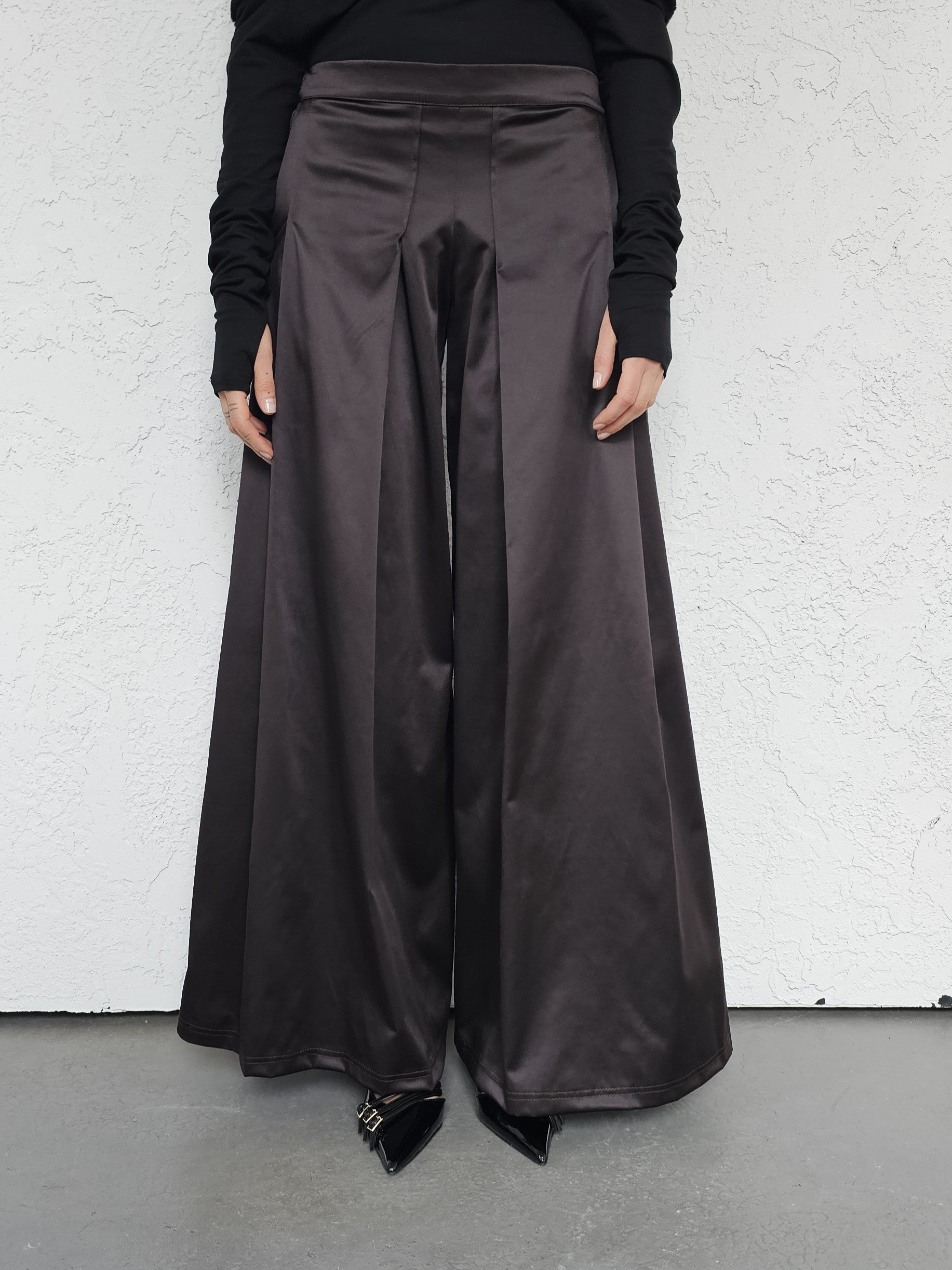 • OPIS PRODUKTU- Satynowe spodnie z domieszką bawełny o szerokim kroju z zakładkami z przodu. Szeroka nogawka, bardzo komfortowy fason. Zapinane z boku na kryty zamek. Z tyłu w pasie guma która pozwala dopasować się do obwodu talii.