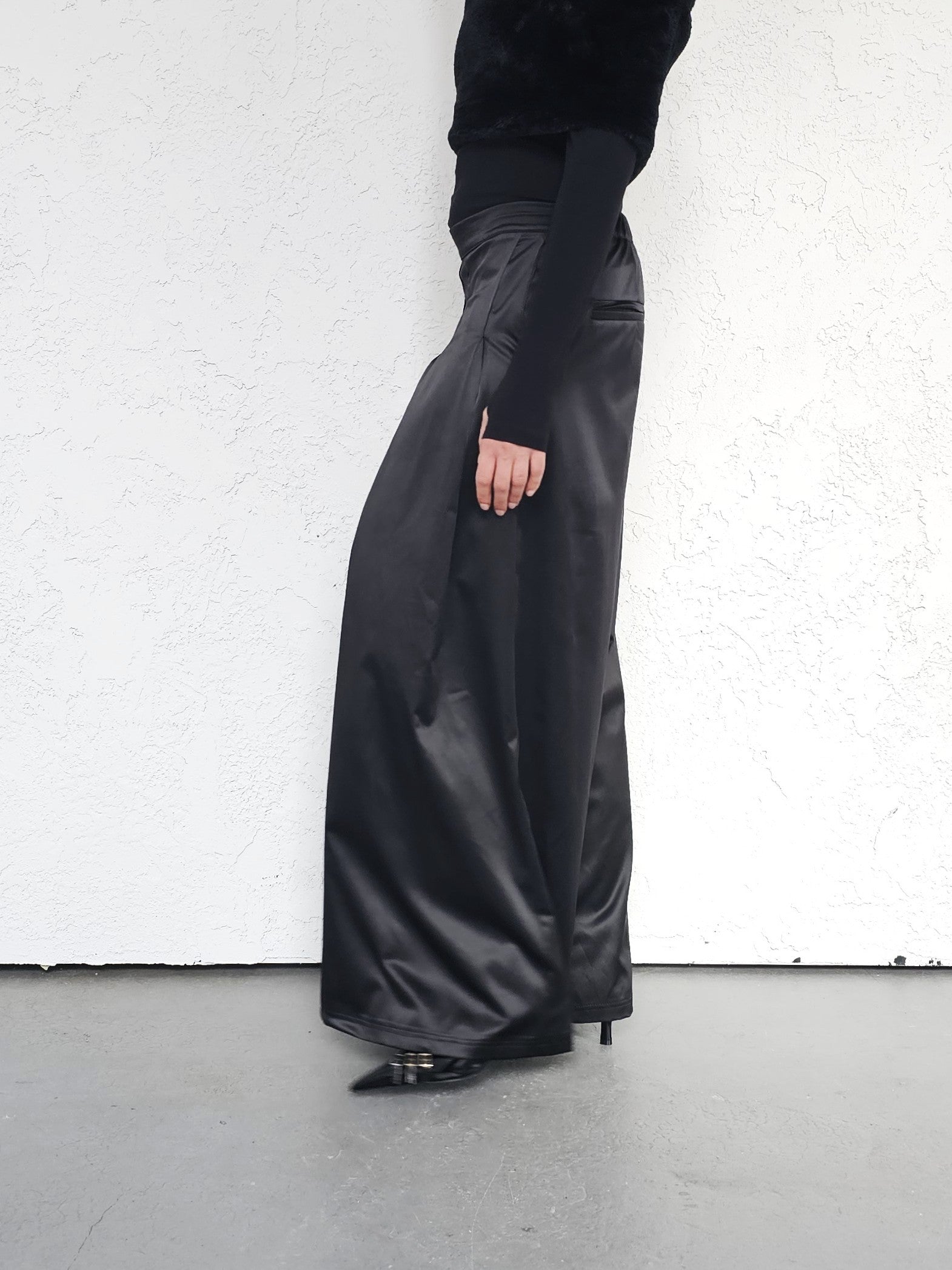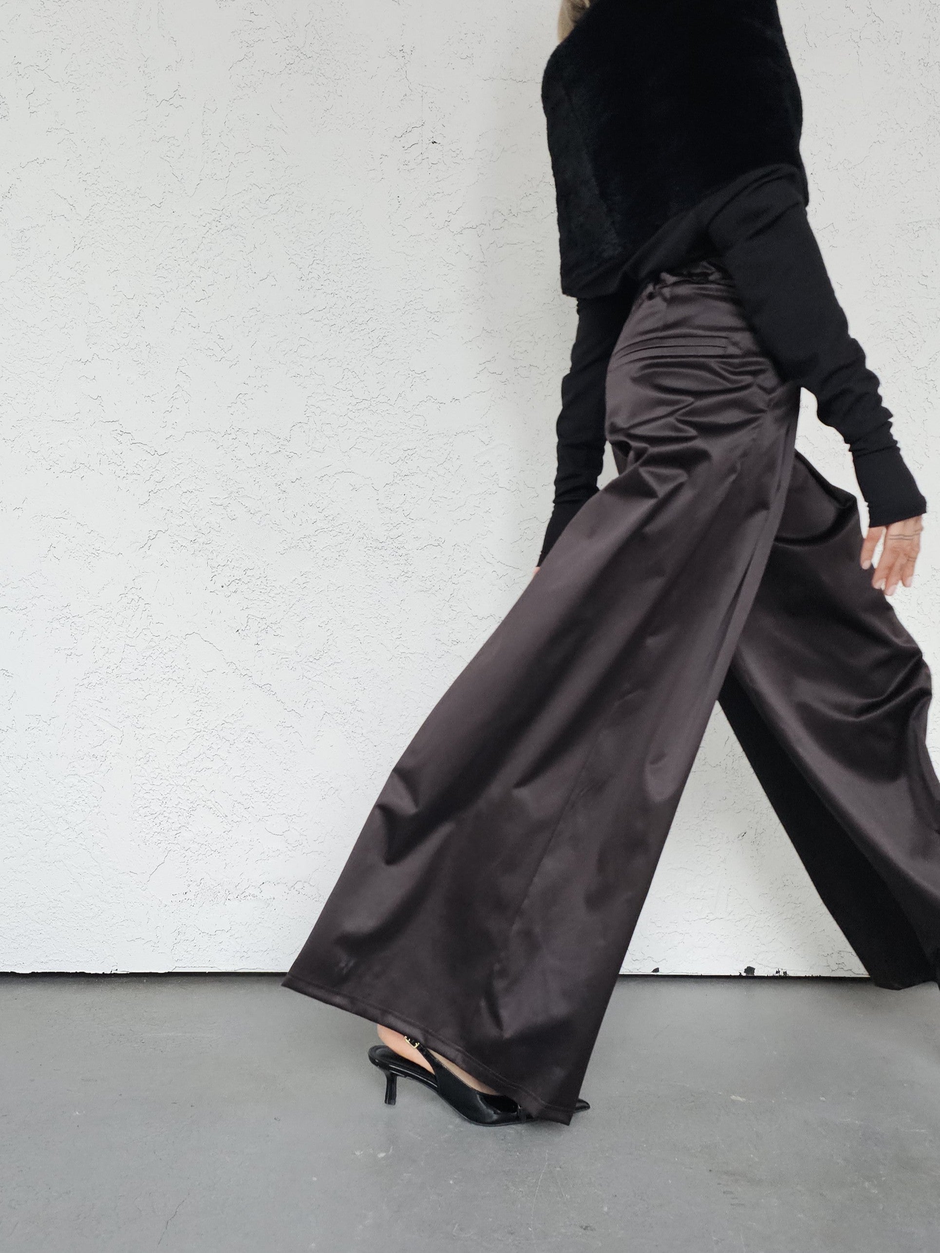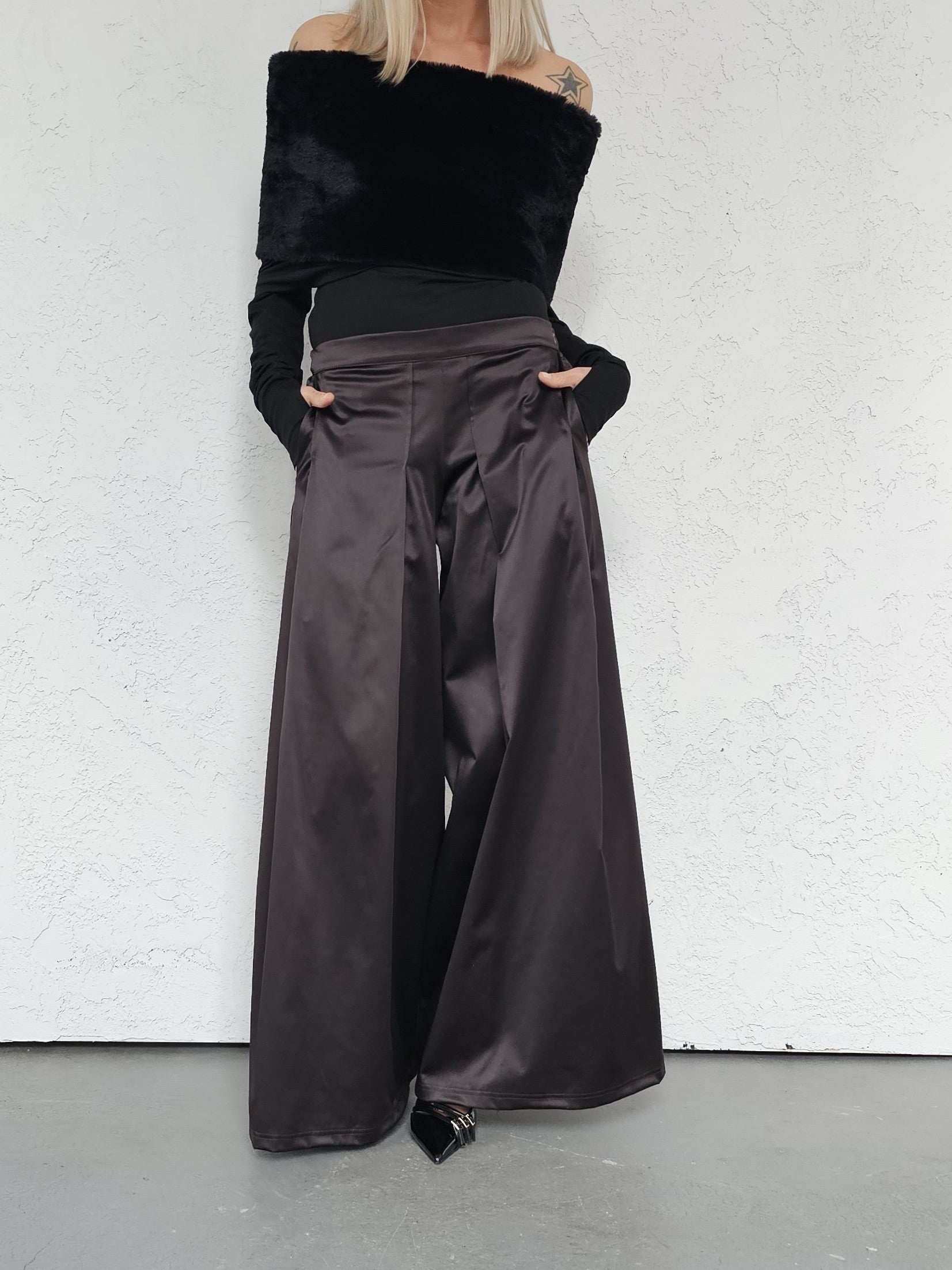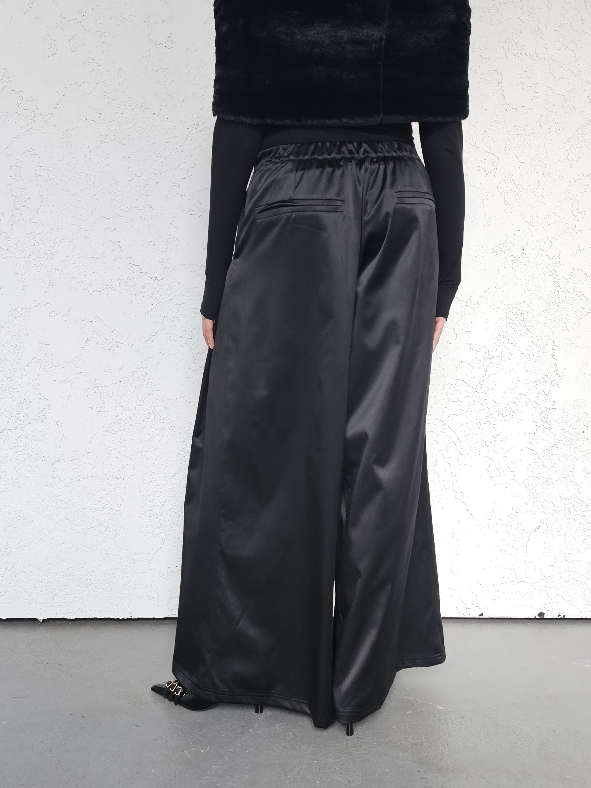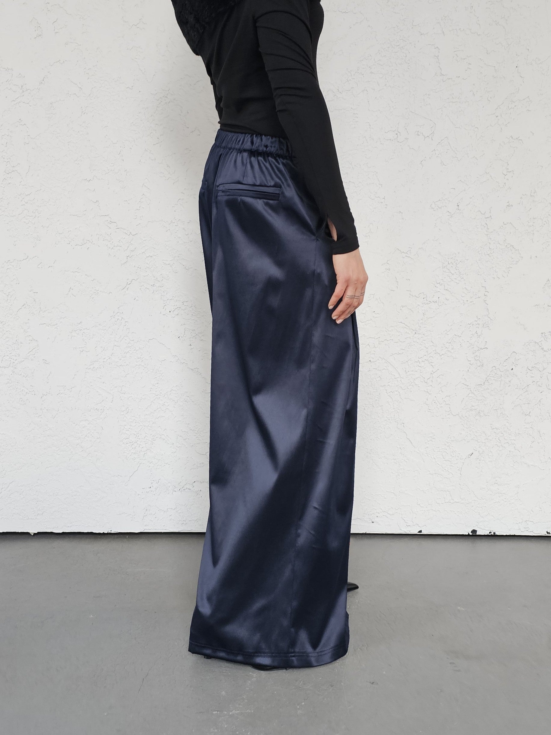 • OPIS PRODUKTU- Satynowe spodnie z domieszką bawełny o szerokim kroju z zakładkami z przodu. Szeroka nogawka, bardzo komfortowy fason. Zapinane z boku na kryty zamek. Z tyłu w pasie guma która pozwala dopasować się do obwodu talii.