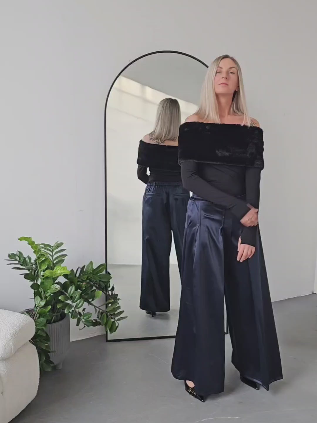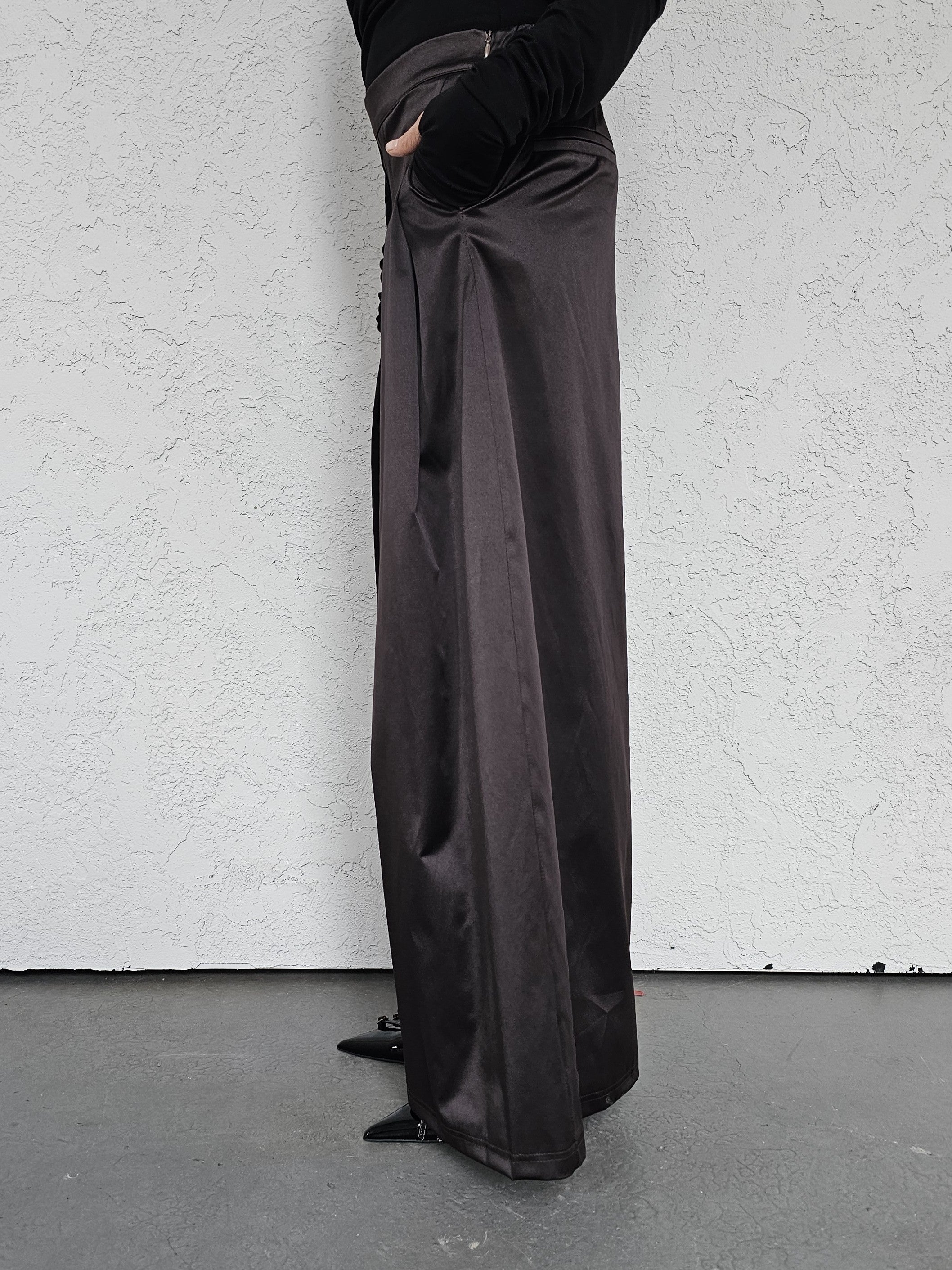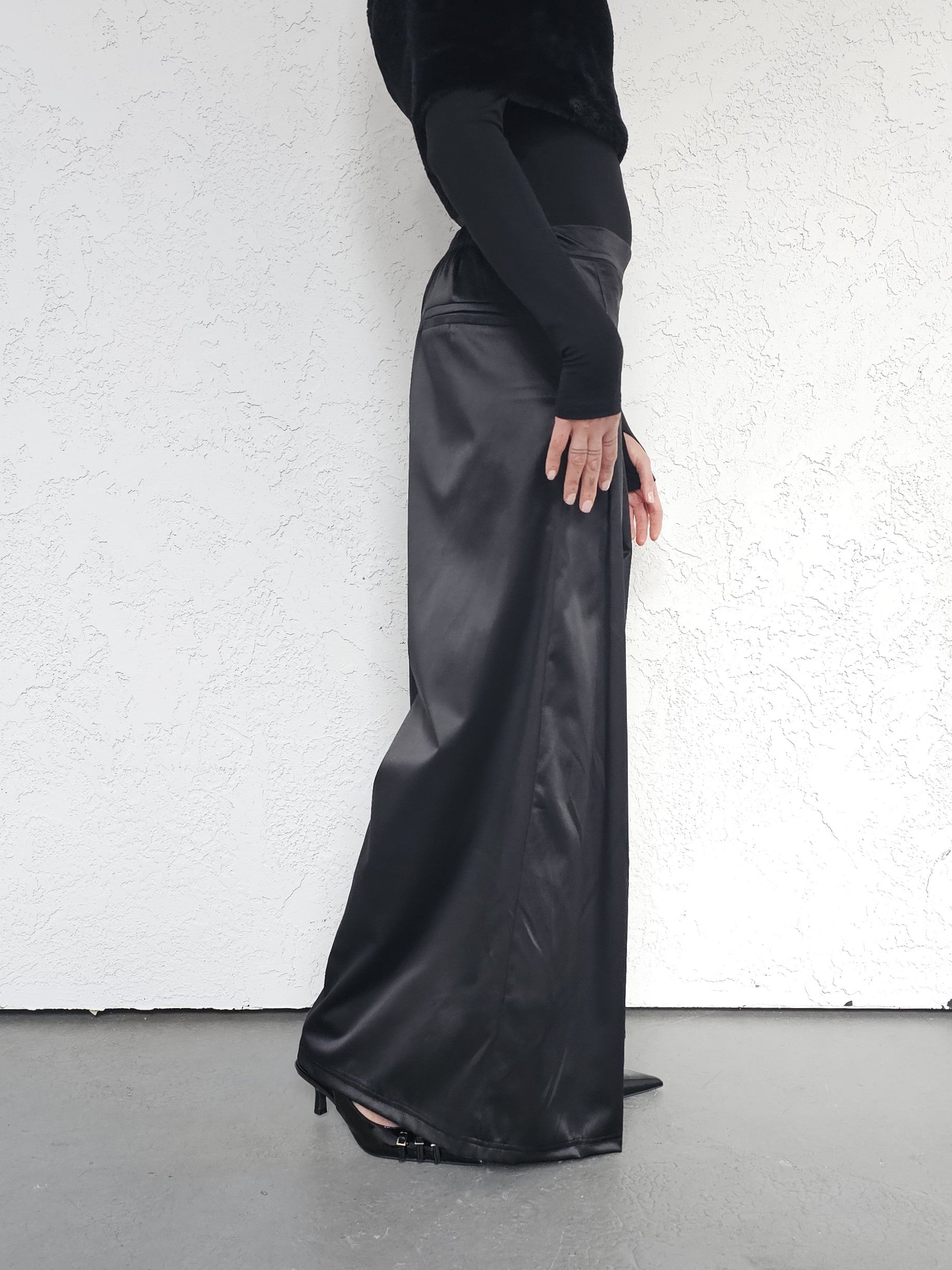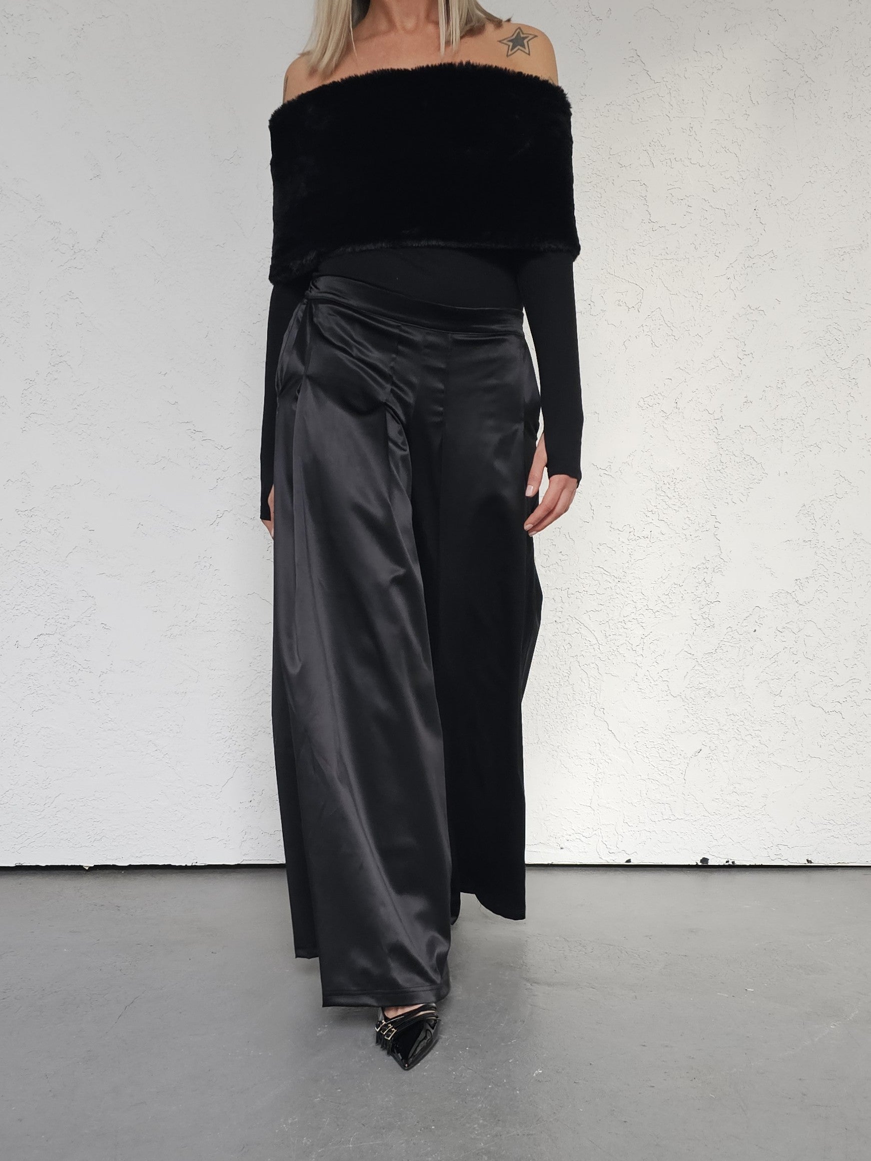 • OPIS PRODUKTU- Satynowe spodnie z domieszką bawełny o szerokim kroju z zakładkami z przodu. Szeroka nogawka, bardzo komfortowy fason. Zapinane z boku na kryty zamek. Z tyłu w pasie guma która pozwala dopasować się do obwodu talii.